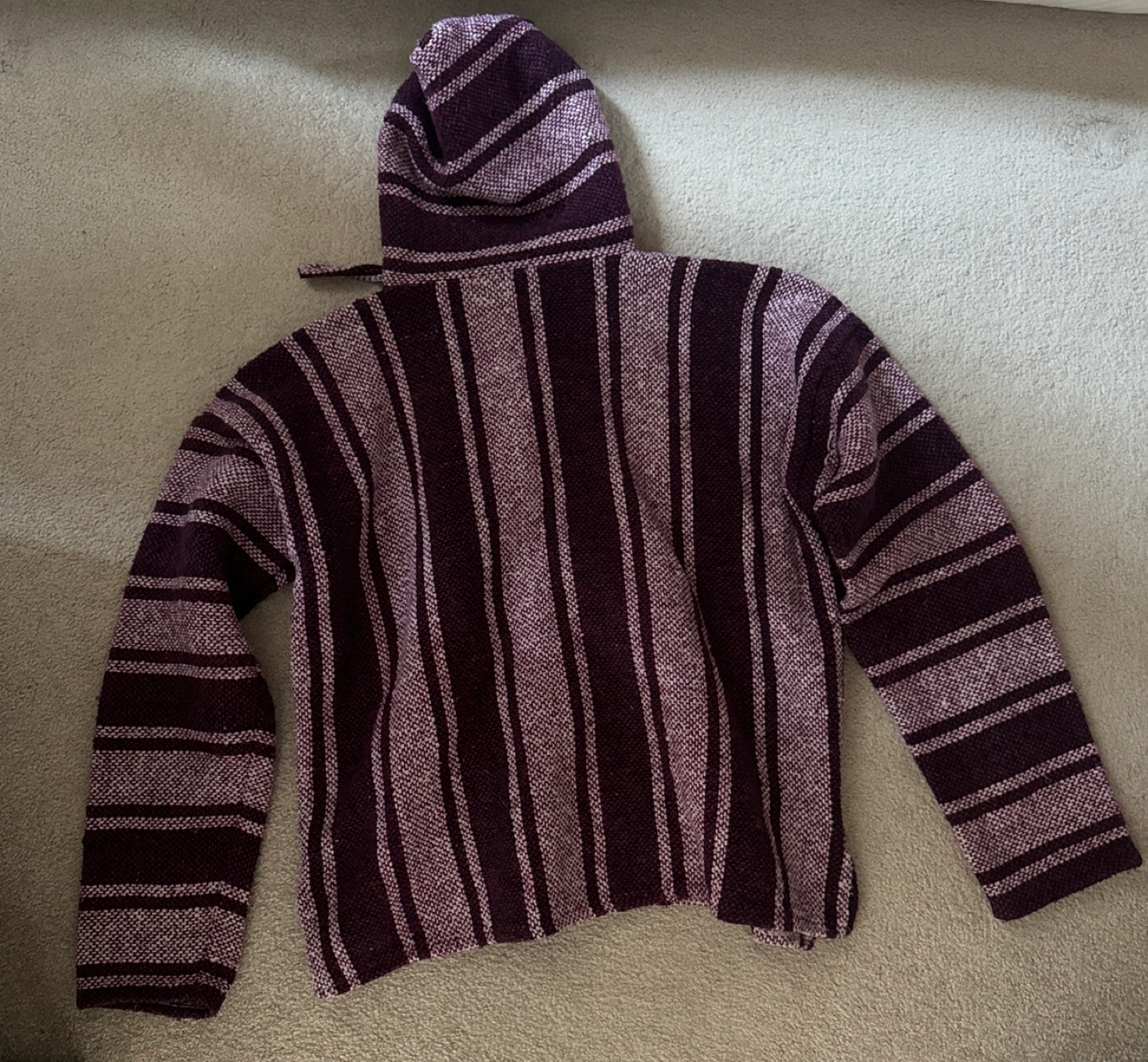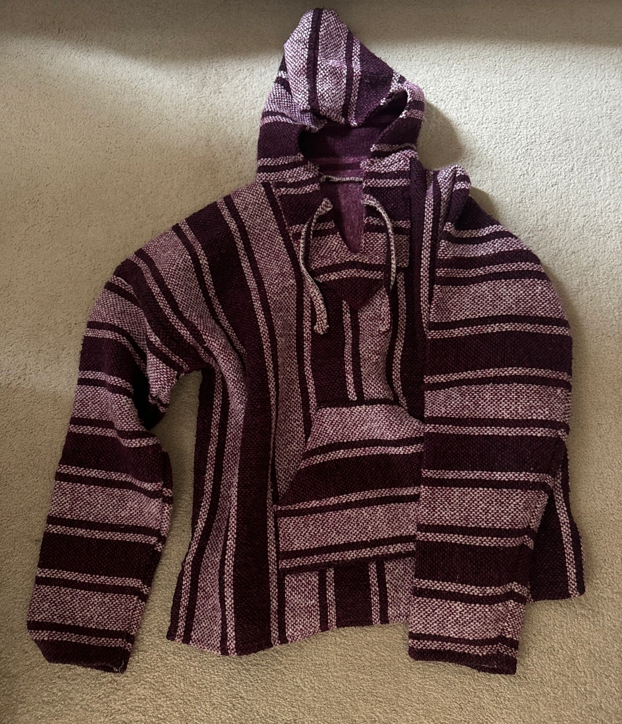 A purple and white striped hooded sweater with a relaxed fit. The sweater has a loose fit, and long sleeves. It features a drawstring hood. It is made of a soft cotton blend material. It is perfect for casual wear.