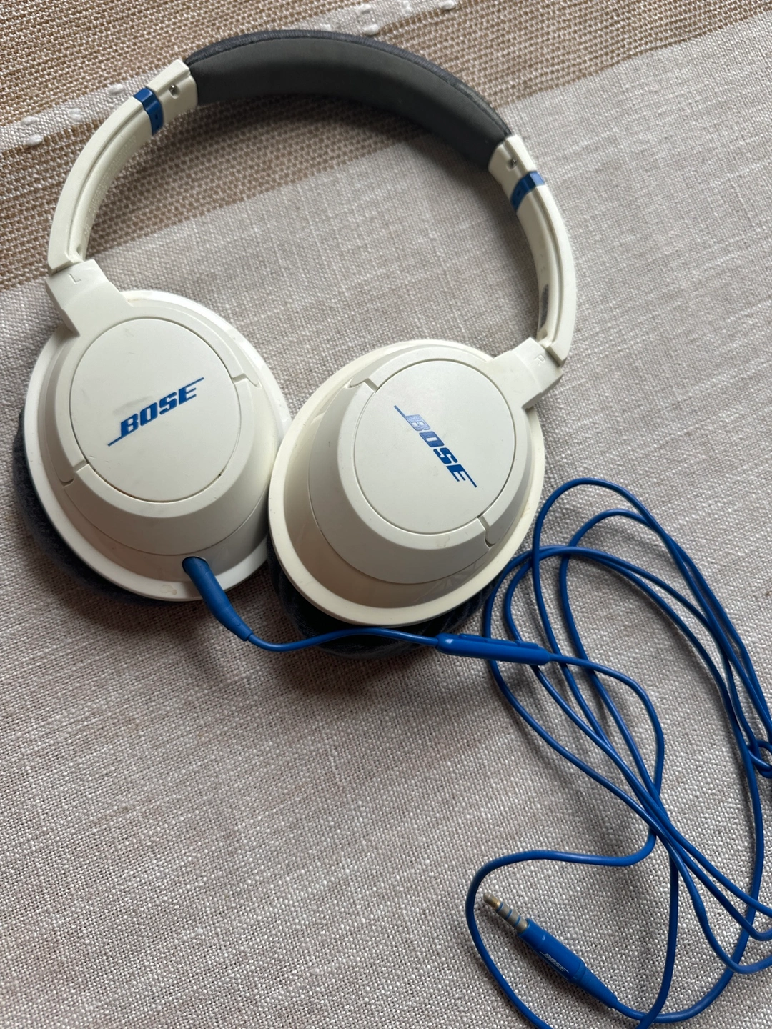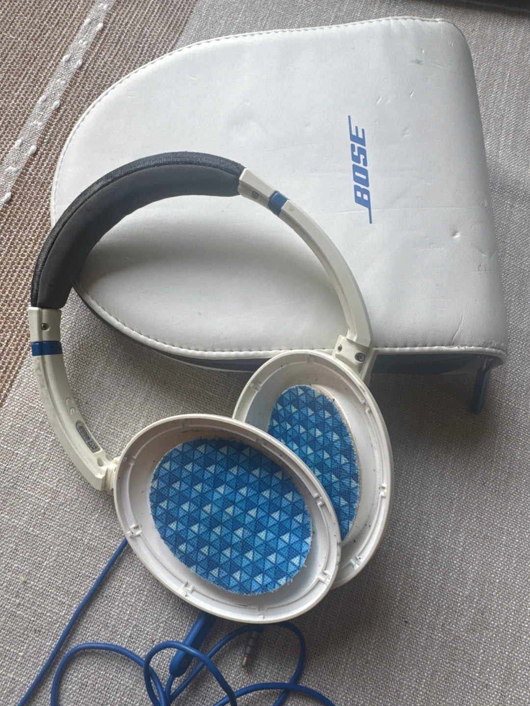 475These are Bose headphones with a carrying case. They have a blue cord and are white with blue accents. Ear sponge needs a replacement which I took out it as shown on the picture. Bose website sells it.