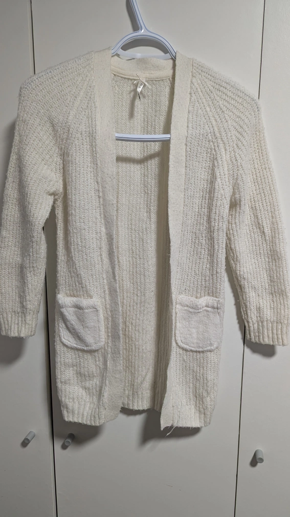 A white knit cardigan with pockets. The cardigan is a size medium and has a long sleeve. It is made from a soft material and has a relaxed fit. It is perfect for layering over a shirt or dress. It is in good condition and has been washed and dried.