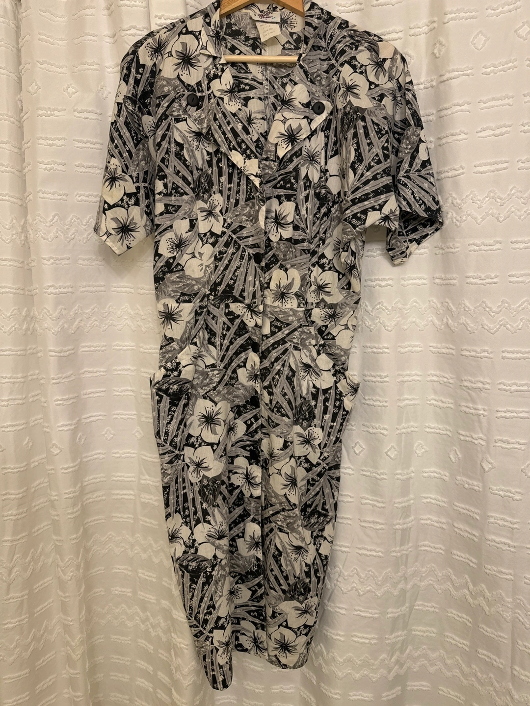 Short-sleeved dress with a floral print. The dress has a collar and button-up front. There are two pockets on the front of the dress. The dress is a midi length. Bought from Hawaii.