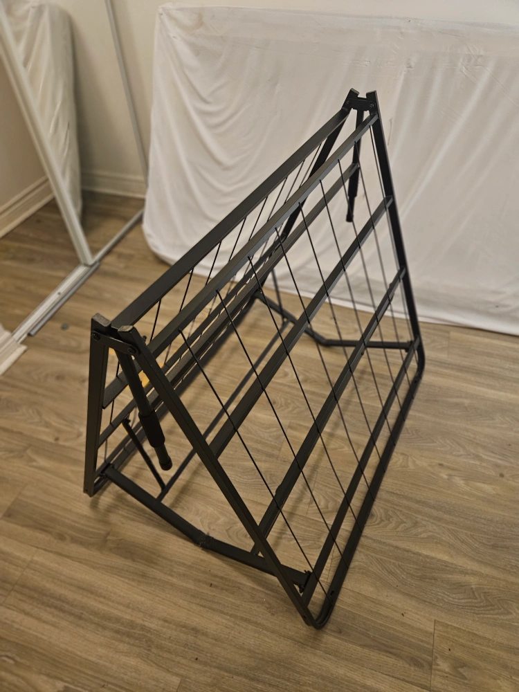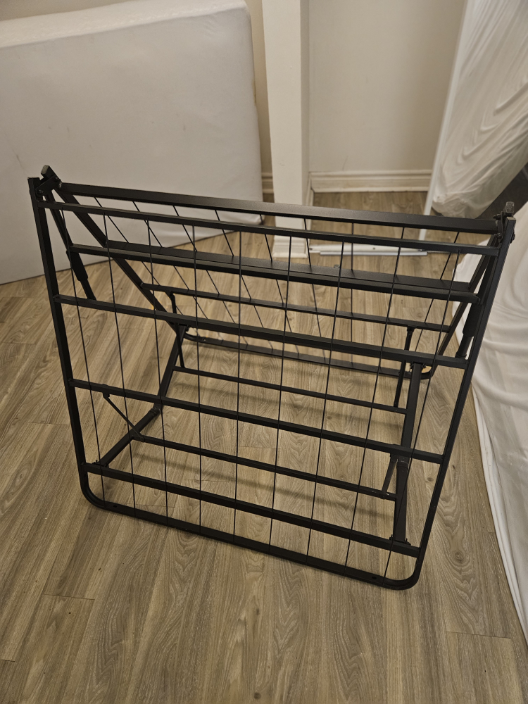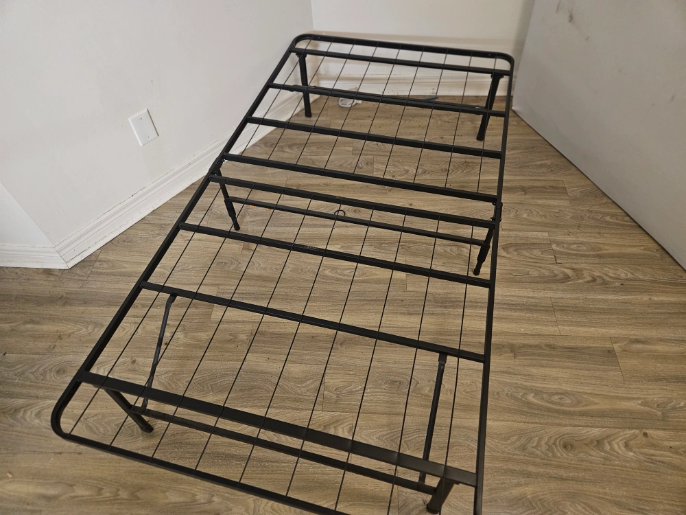 A twin-sized metal bed frame that folds in half for easy storage. It is in good condition. pick up today