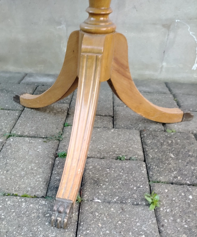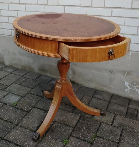 Vintage Antique Drum Table with original 25.25" leather inset. There is a single drawer. 4 lion head brass handles around the tables' edge. Unique design featuring a single pedestal leg base and 3 carved legs with brass lion claw footings.