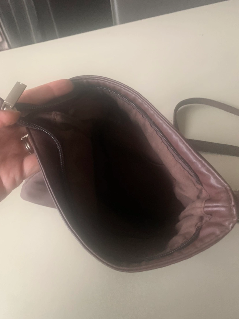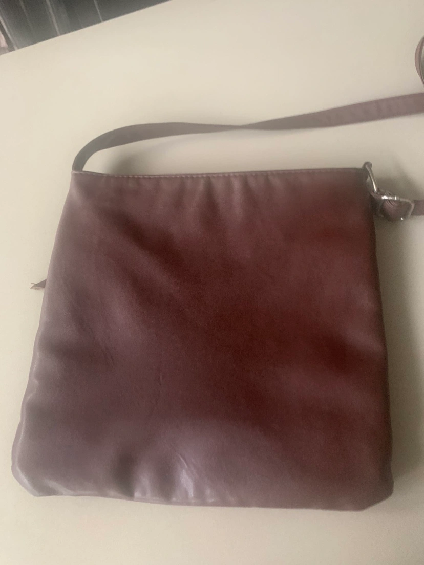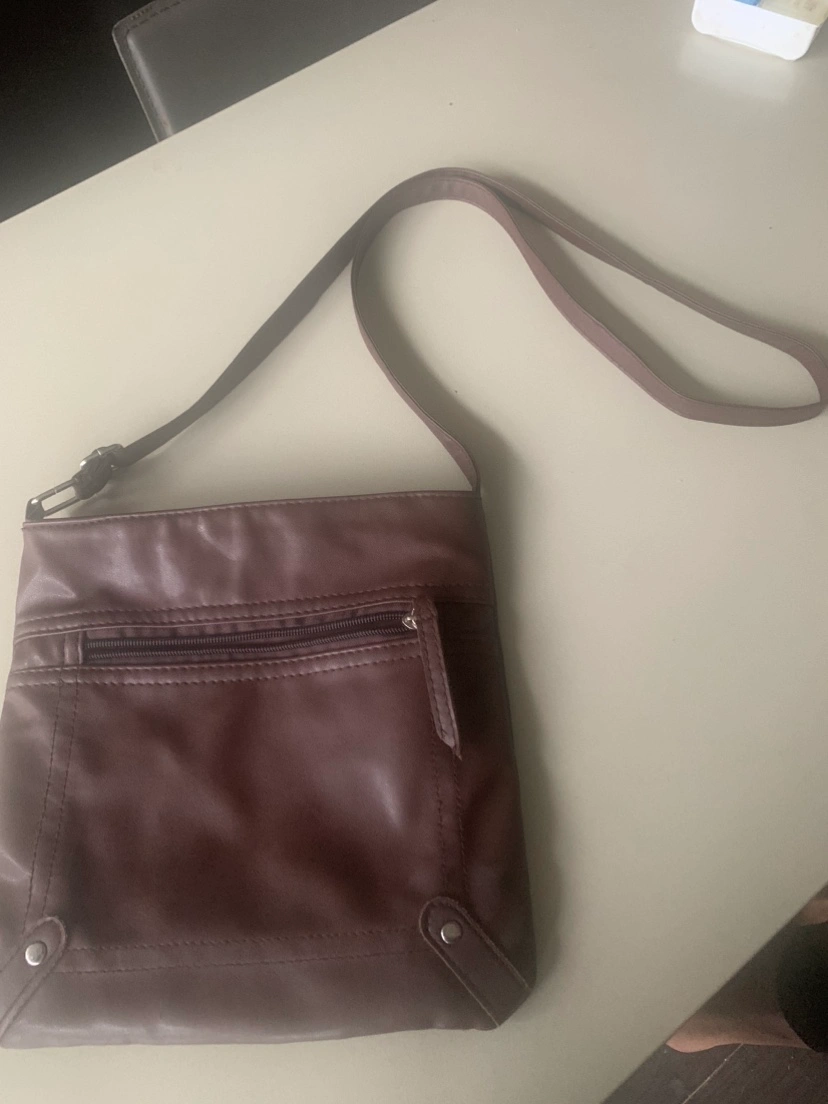 Small chocolate brown vegan leather crossbody bag with a zipper closure and adjustable strap. It has a small zippered pocket on the front of the bag and a non zippered pocket on the inside. Perfect when you need to carry your essentials but don’t want to carry a large bag.