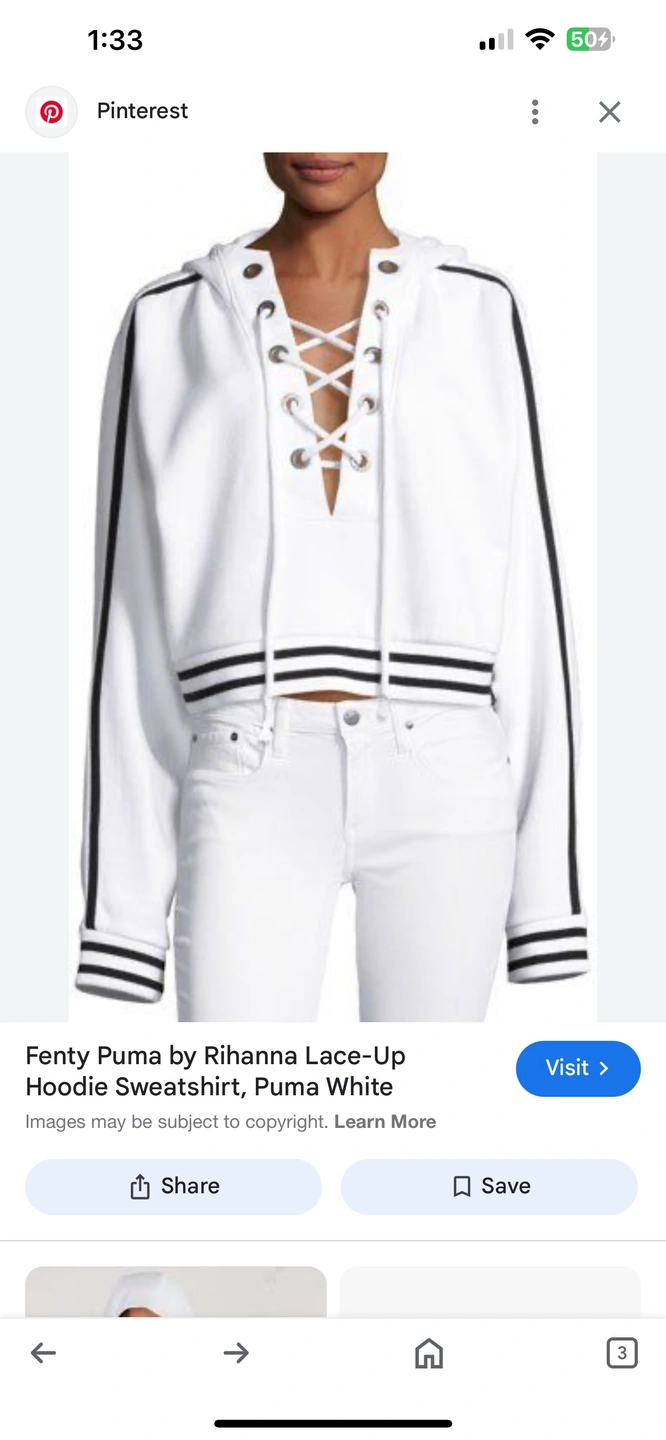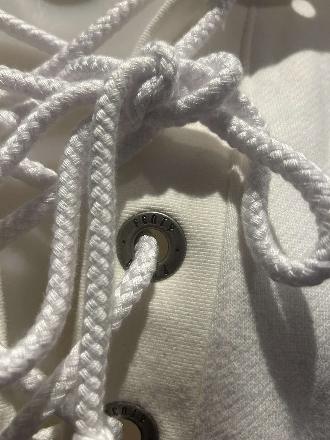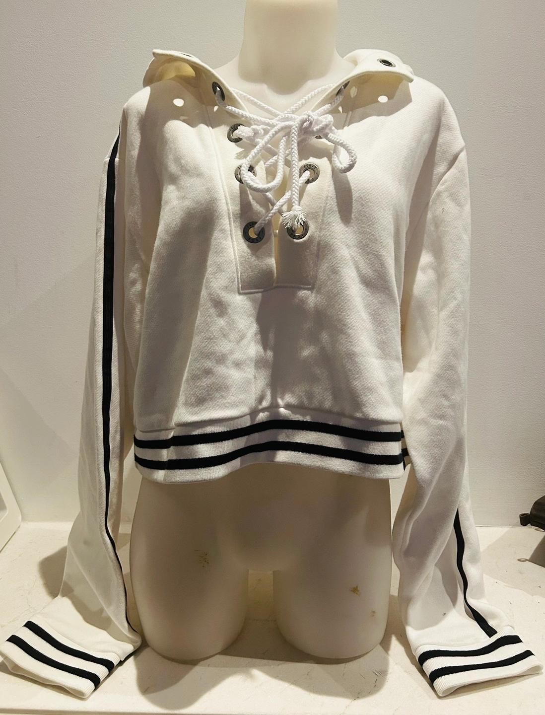 New with tags. White Fenty by Rhianna hoodie with black stripes. Has a lace-up detail at the front. Rising sun logo on back. Size medium.