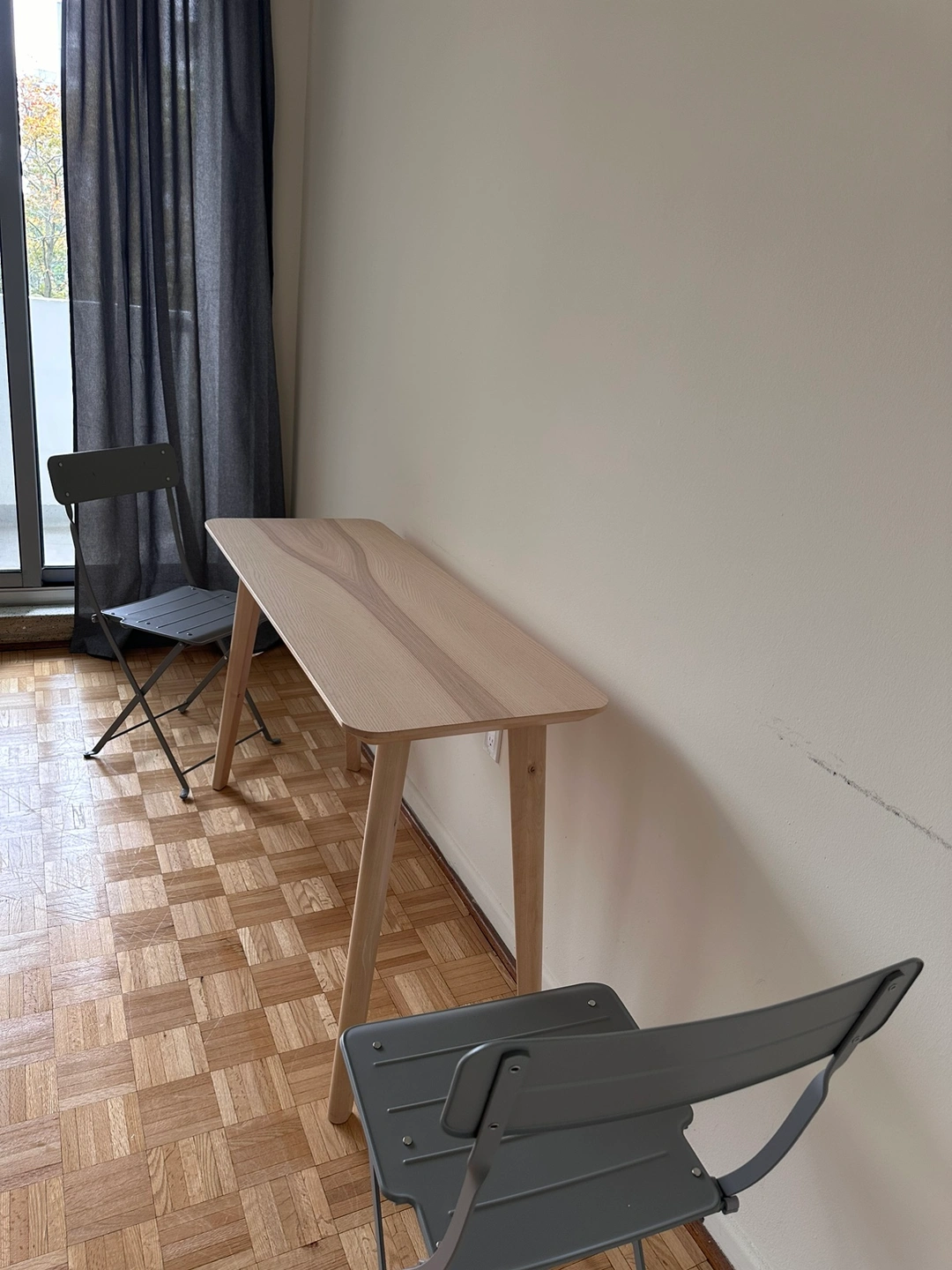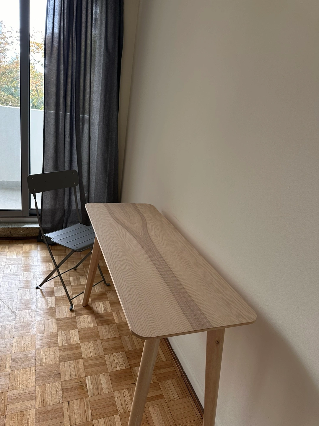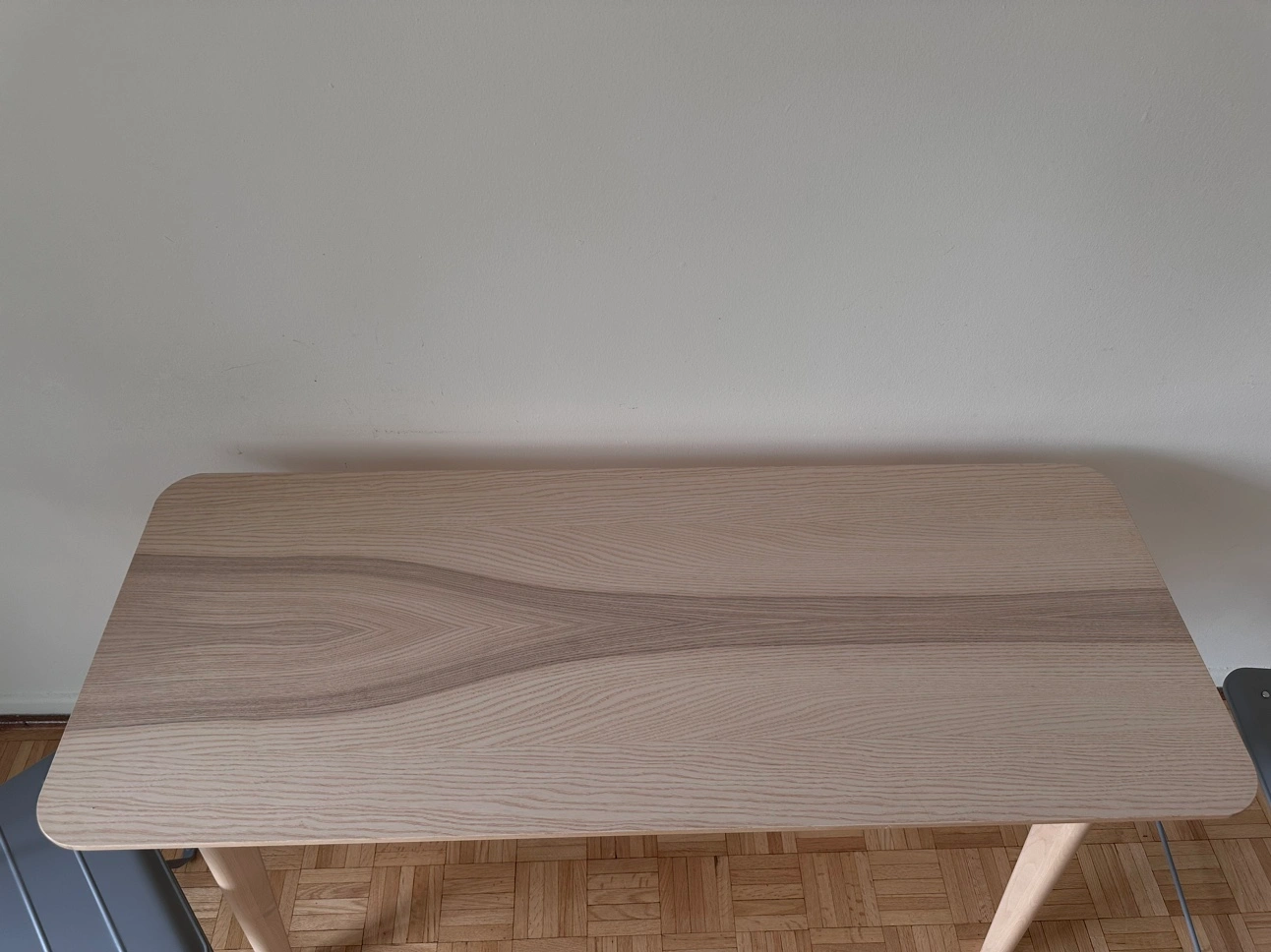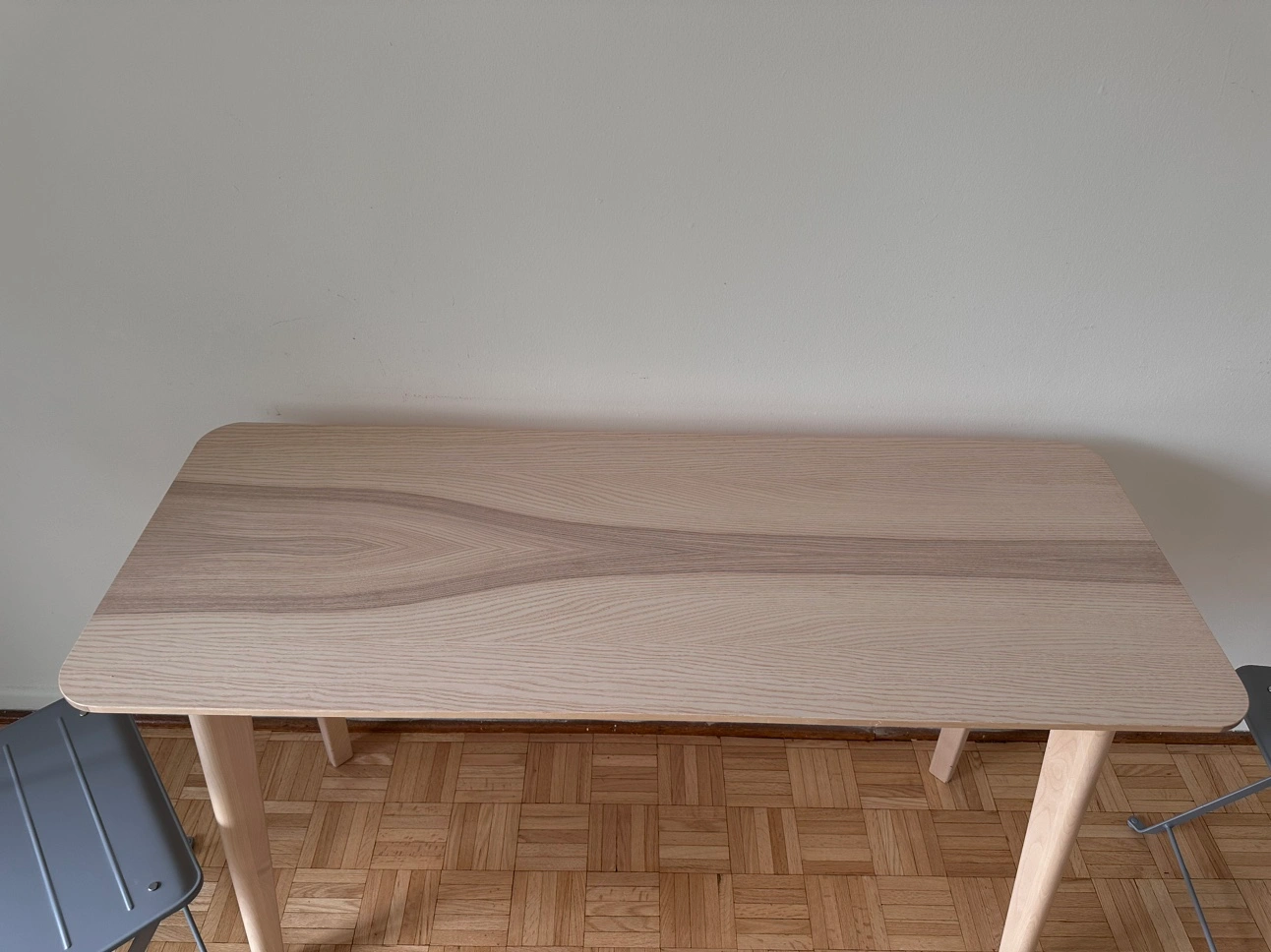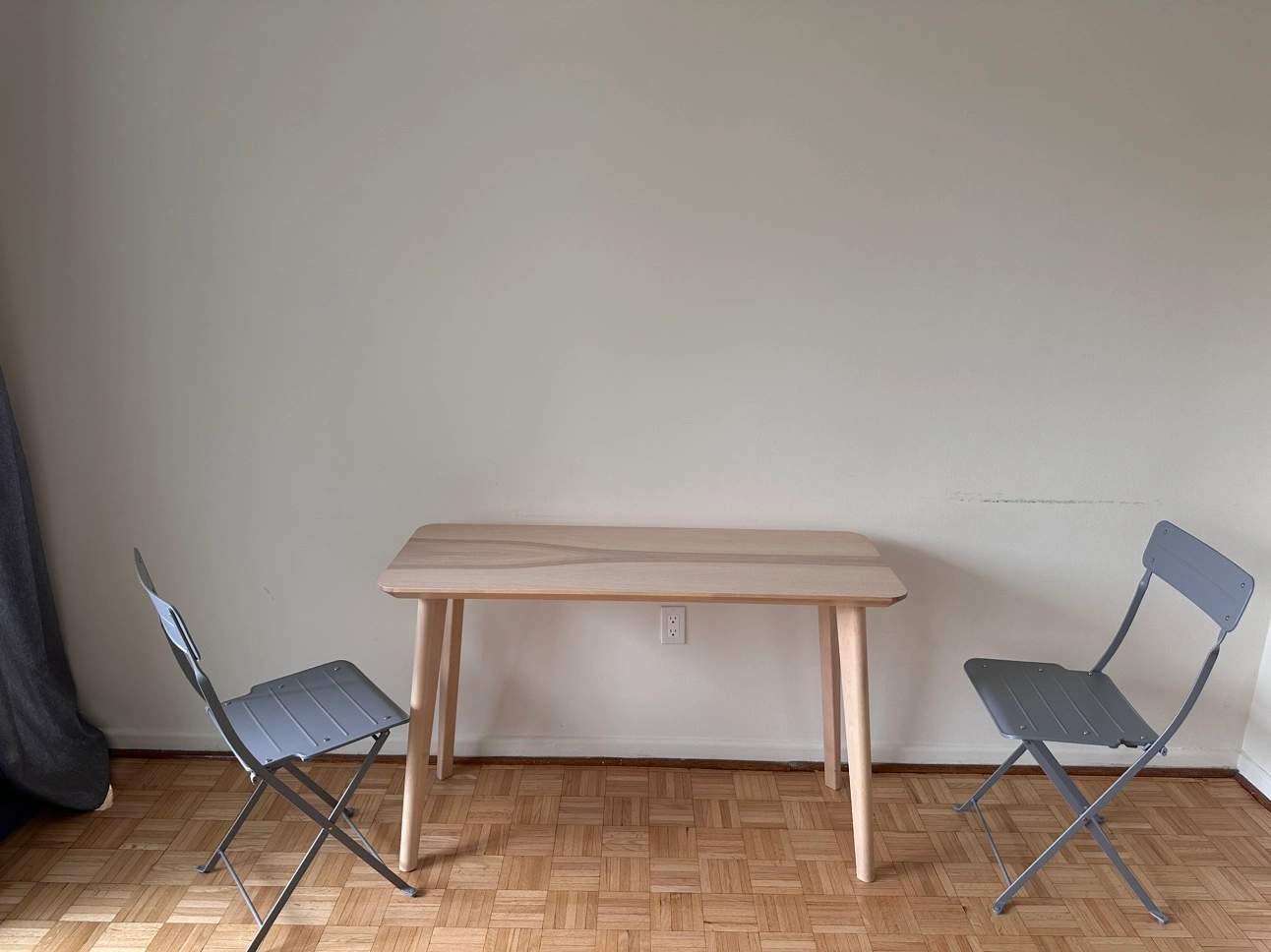 A small wooden table with a unique grain pattern. It has four legs and is perfect for a small space. It comes with two chairs. It is great for a small apartment or for a small study area.