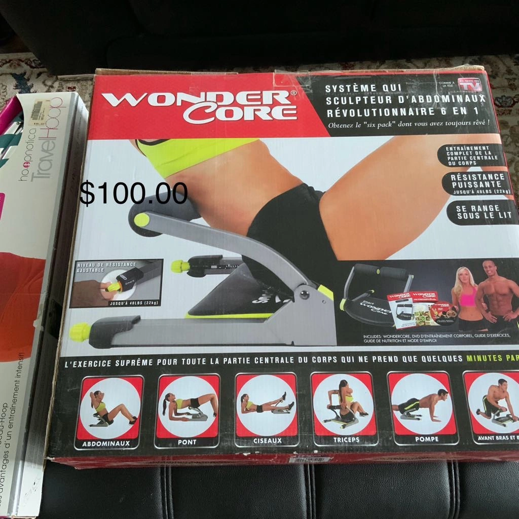 This is a Wonder Core 6 in 1 exercise machine. It features a resistance level that is adjustable up to 48lbs. It is great for working out your abs, arms, and more.