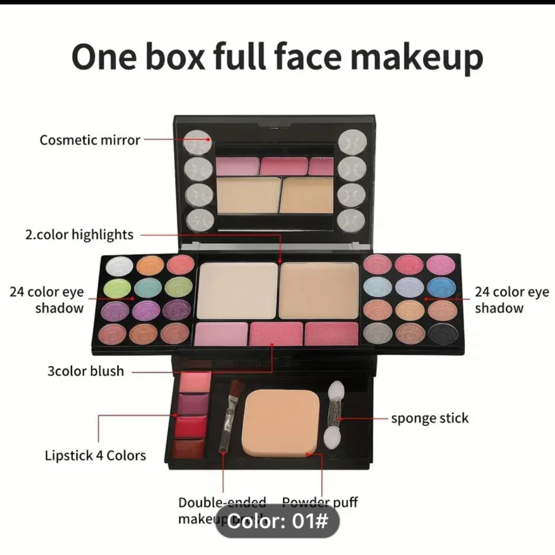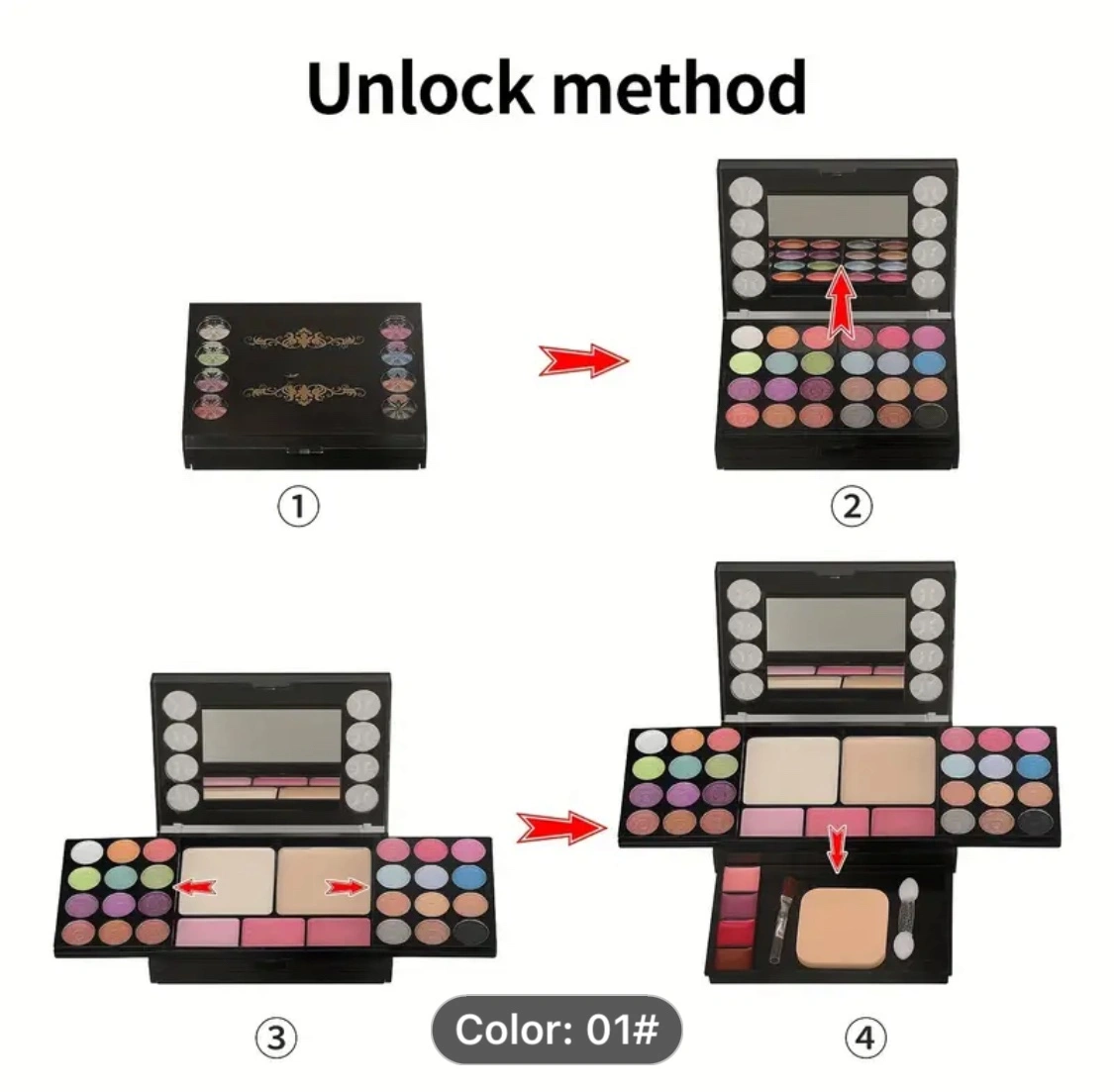 This kit includes eyeshadow, blush, lipstick, foundation, and more. It also comes with a mirror, sponge, and brushes. The compact is easy to open and close with a magnetic latch.