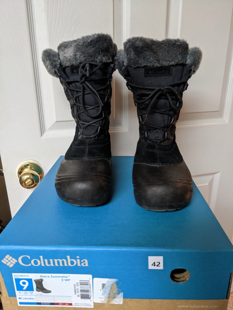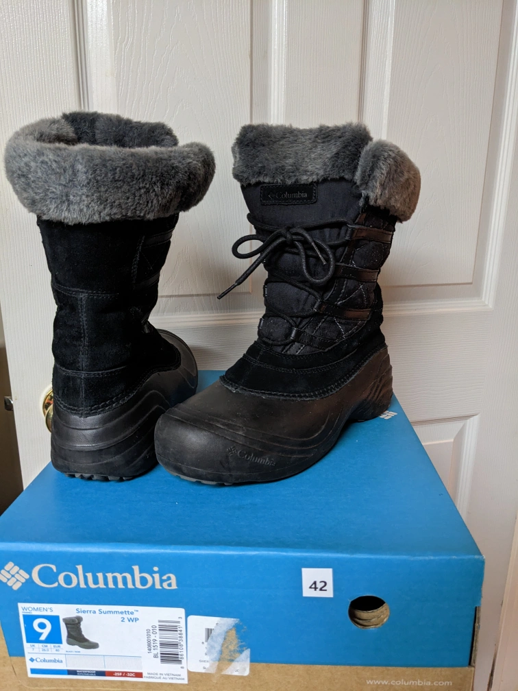 Black women's boots in size 9. The boots are lace-up and have a faux fur cuff. They have a rubber sole with tread for grip. The boots are water-resistant and have a warm lining. They come with the original box.