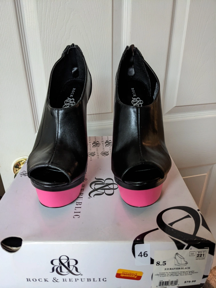 Black peep-toe wedges with a pink platform and wedge. Size 8.5. These are a great, stylish addition to your wardrobe for any occasion!