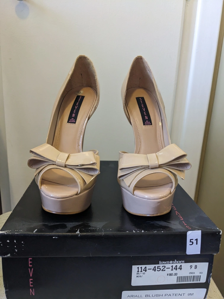 Size 9, platform heels with a bow on the front. These shoes are perfect for any special occasion. They come with the original box.