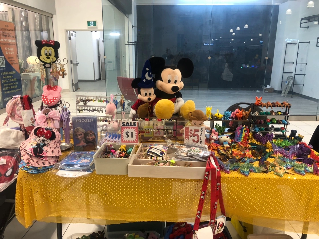 A table full of various items including Mickey Mouse, Minnie Mouse, Frozen, and other characters. There are also many other items including keychains, toys, and more accessories, taylor swift stuffs and hello kitty stuffs starting at 1$.