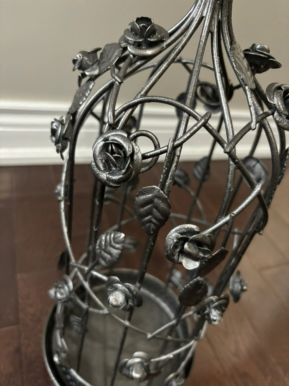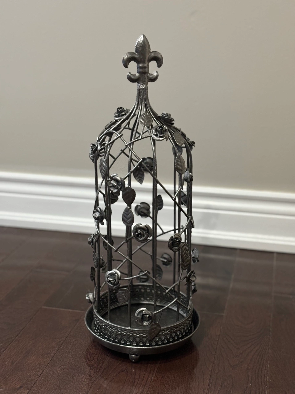 This cage is made of metal and features a beautiful rose design. Can hang it without the base (base isnt attached) or sit it on the shelf with the base. Good for candles or weaving plants around it.