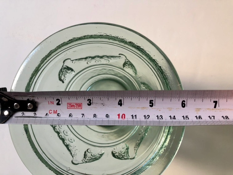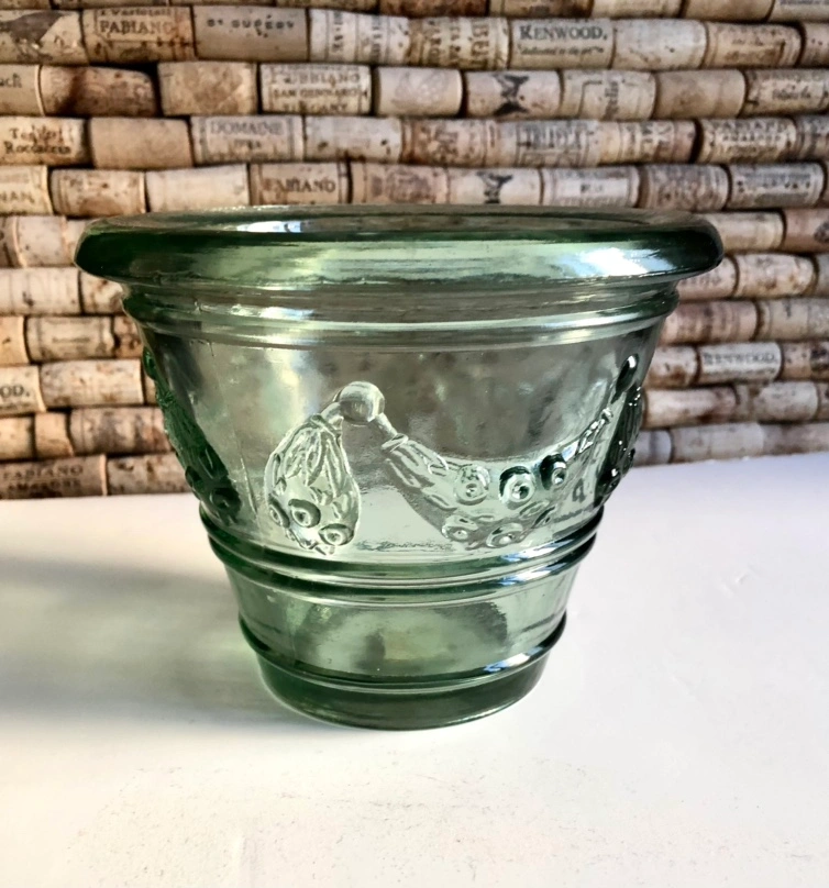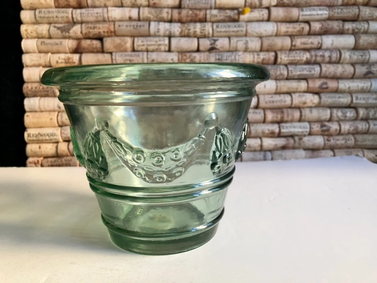 This is a small Spanish recycled green glass planter or votive candle holder with an embossed design.
