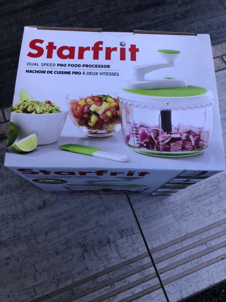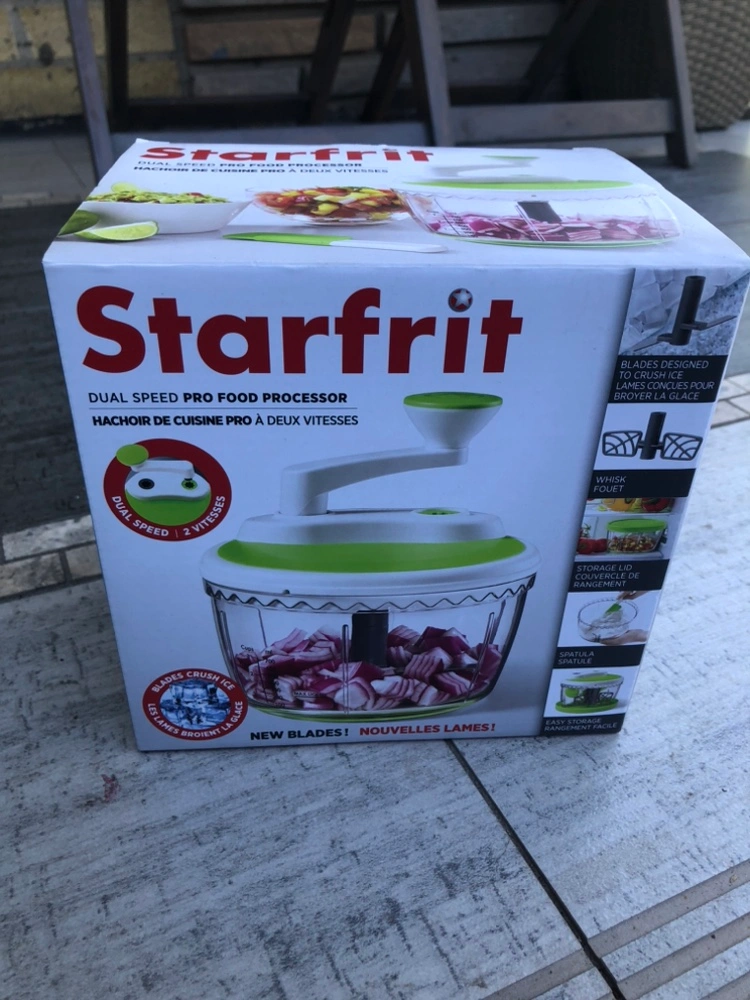 New Starfrit Dual Speed Pro Food Processor. Includes a spatula and a whisk. New blades! Easy storage. Comes with a clear container with measurement markings. Great for chopping and mixing.