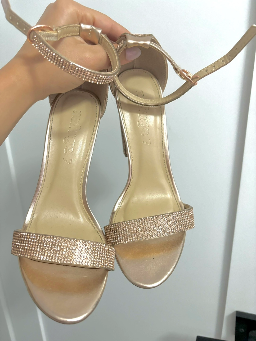 Beautiful rose gold heels with rhinestone detailing. They have an adjustable ankle strap and a chunky heel. Perfect for any special occasion!
