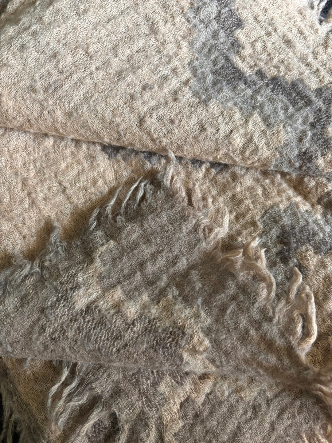 Reversible blanket scarf with hand-finished fringed edges and original jacquard artwork