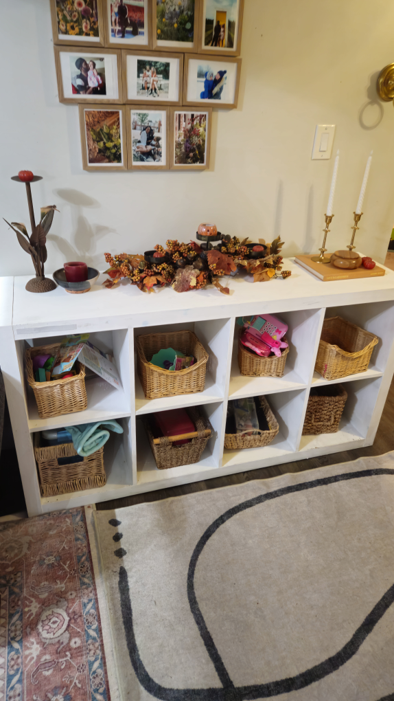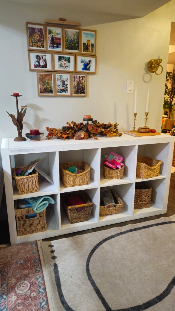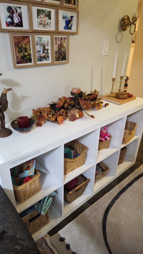 White storage unit with 8 cube compartments. The unit is in good used condition. The unit is 34" tall, 39" wide and 14" deep.