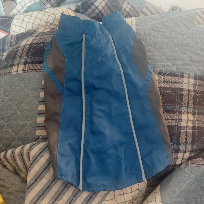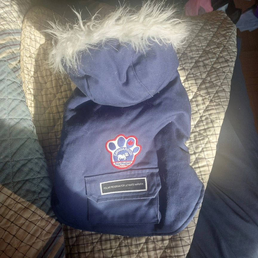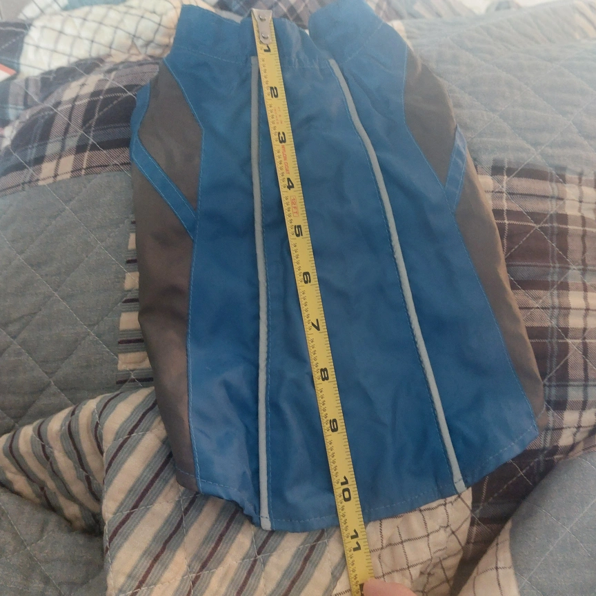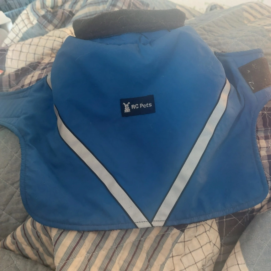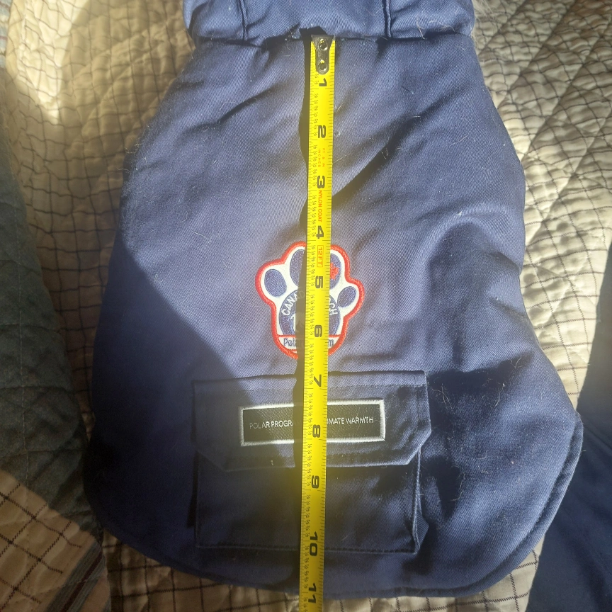 One Canada Pooch, very thick, warm, high quality coat 11". One RC pets waterproof jacket 10". One shell jacket 10". One brand new/never worn, fleece lined corduroy coat 10"