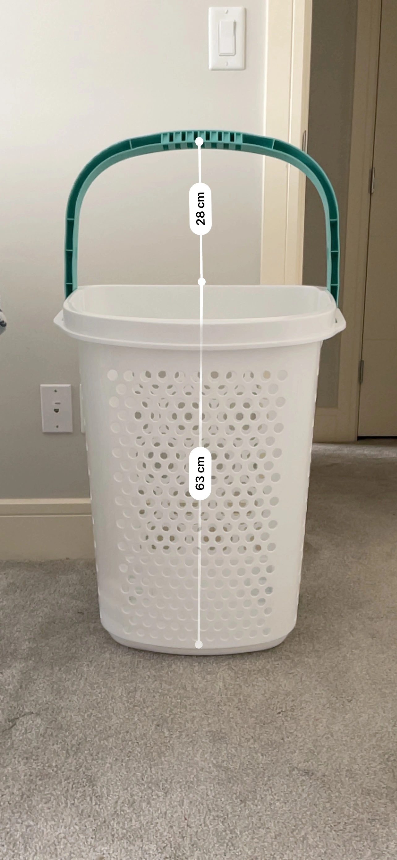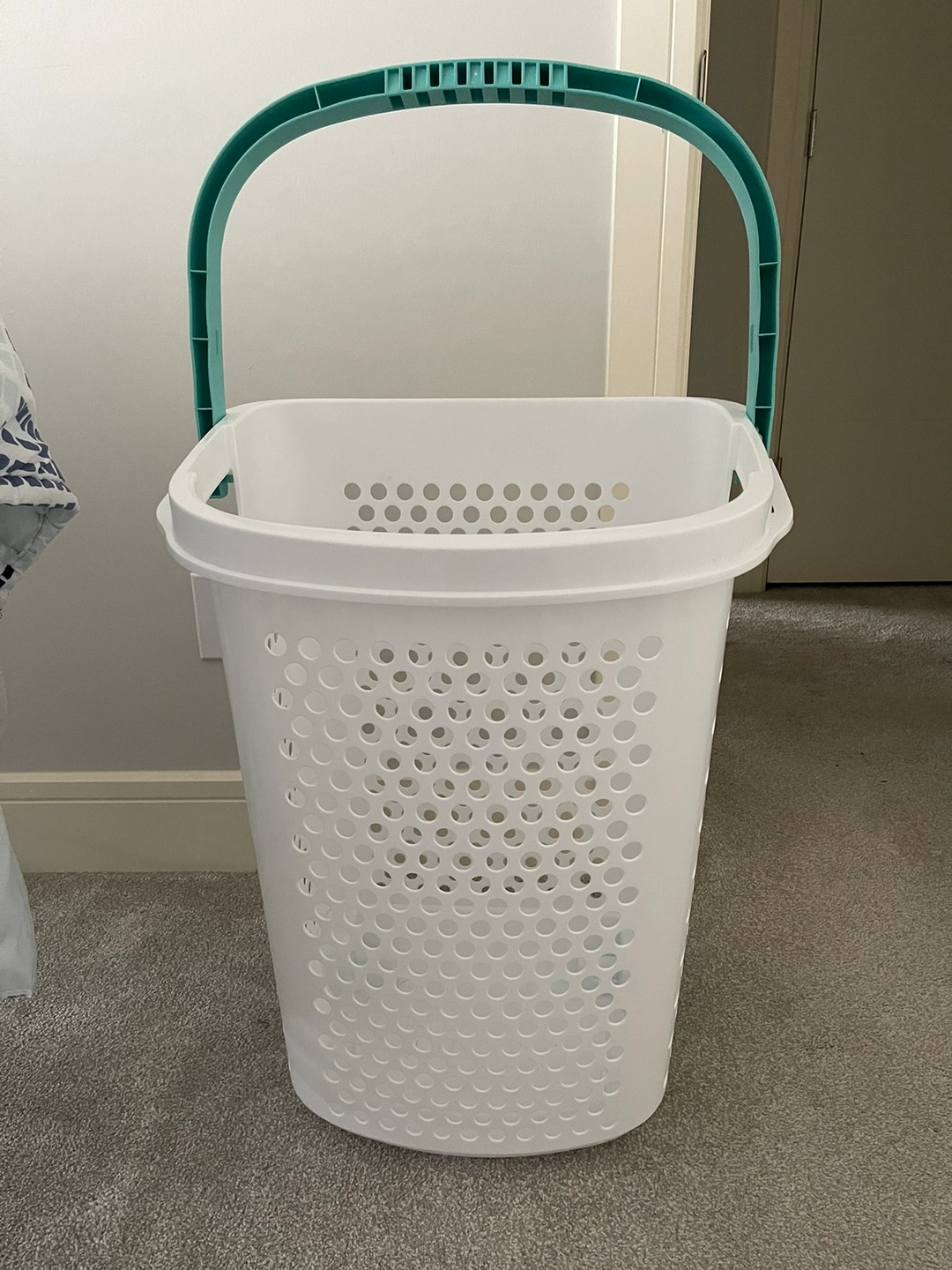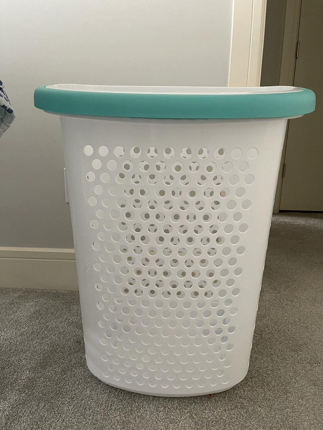A white laundry basket with a teal handle, approximately 63 cm tall, made of durable plastic with a hole pattern for breathability, and in good condition.