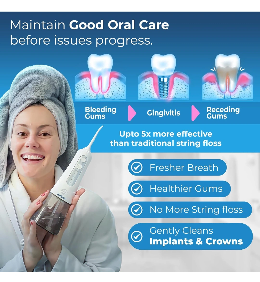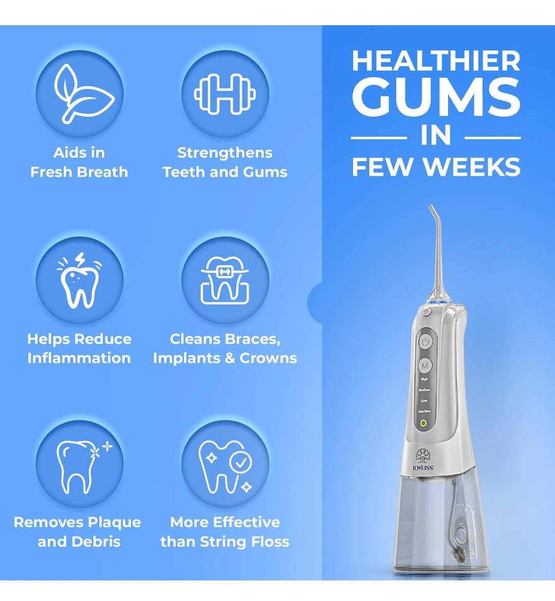 No More String Floss Bid farewell to the painful and unpleasant process of string flossing. The B. WEISS Water Flosser revolutionizes traditional oral care by offering an easier and more effective alternative. Achieve superior results and improved oral health with this innovative cordless water flosser.