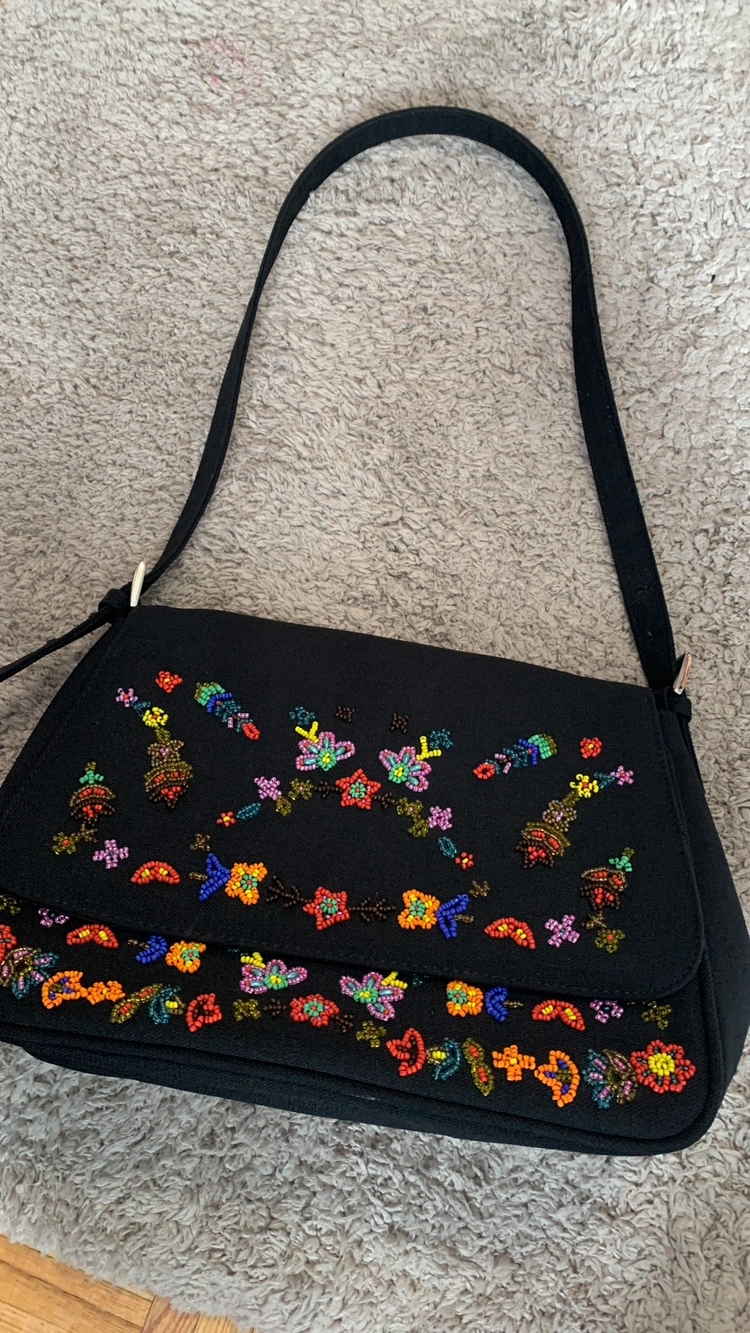 Black purse with a floral design, fully beaded in various colours. The purse has a shoulder strap and a flap closure.