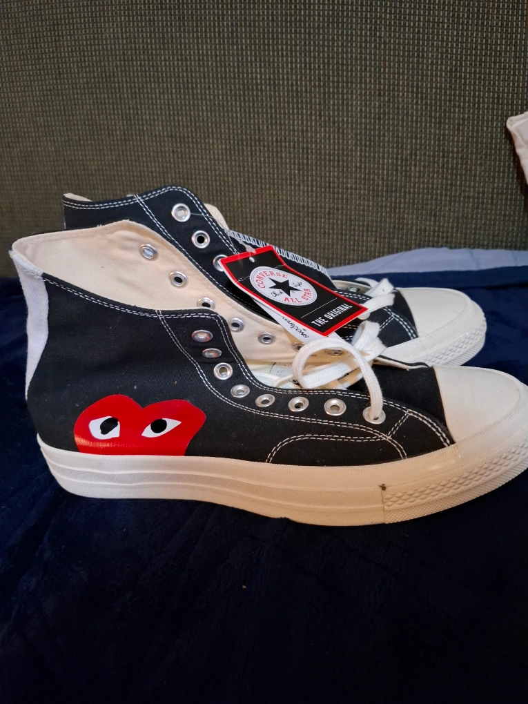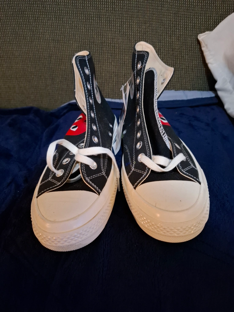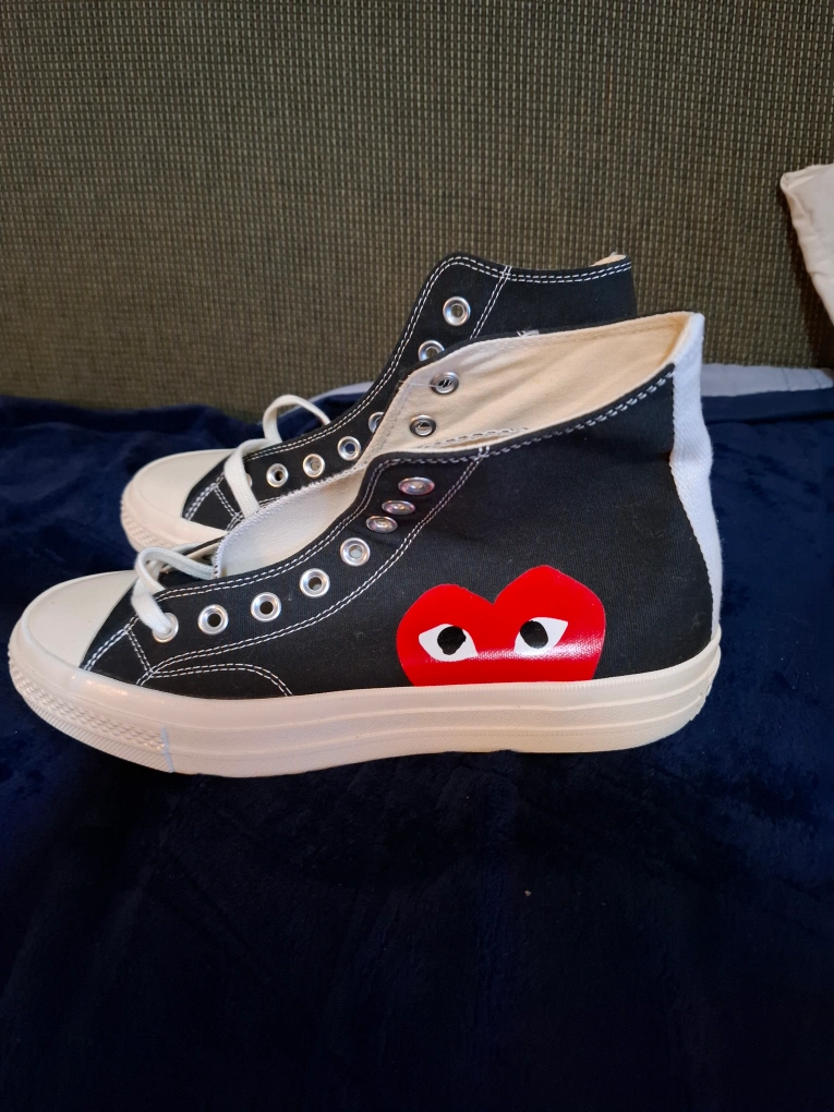 Black high top sneakers with red heart with eyes detail. Comes with original tags. Size US Men's 8.5