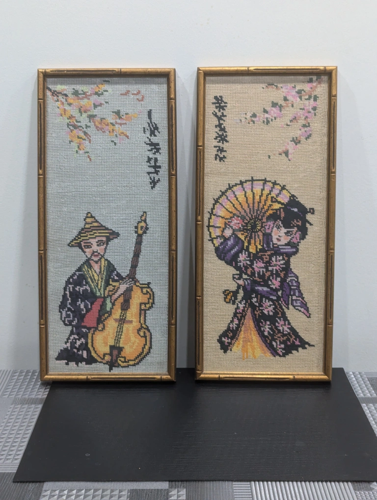 Charming pair of vintage framed needlepoint panels featuring a Japanese man playing an instrument and a woman with a parasol. Each panel measures approximately 18.5 inches high, 8 inches wide, and 1 inch deep.