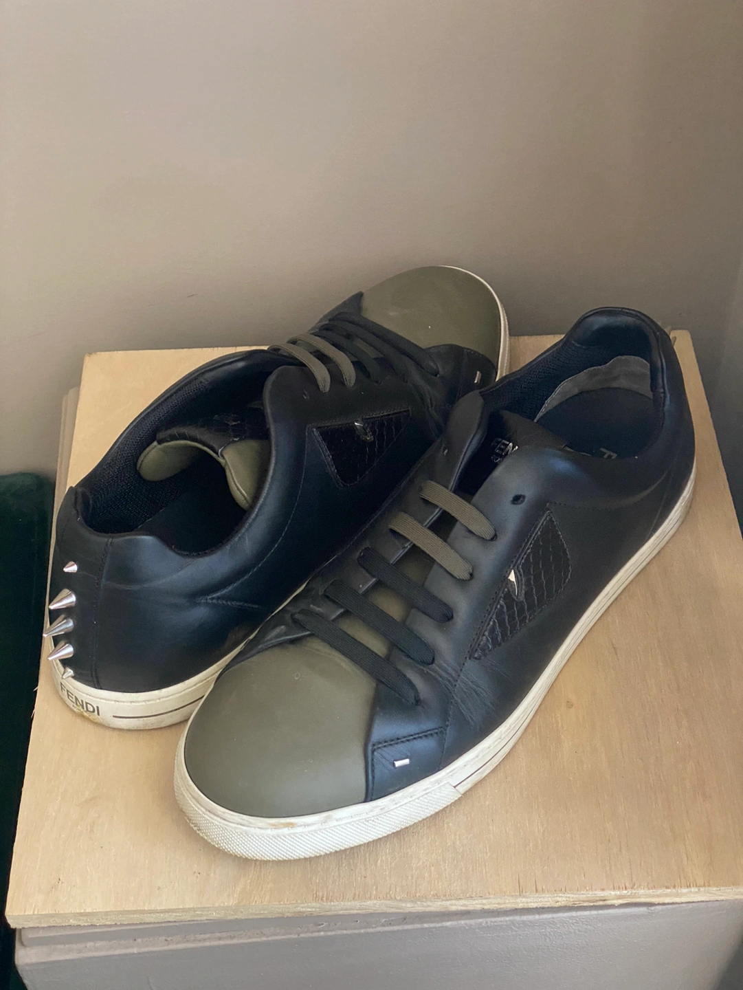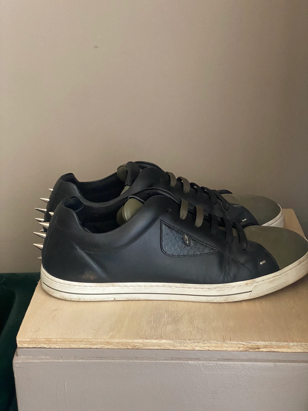 Fendi olive green leather sneakers with silver spike deco in the back. In good condition, signs on wear at bottom. Size: US8 IT 41, Men.