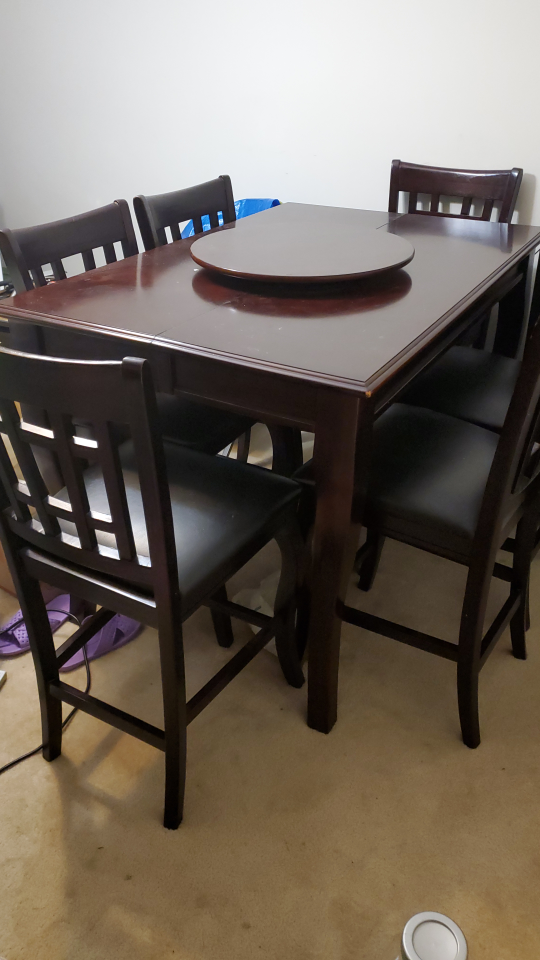 Table with Lazy Susan and 6 chairs but extendable to 8 chairs. extendable unit and chairs included. Excellent condition. Selling cheap for quick sale. Only available for pickup.