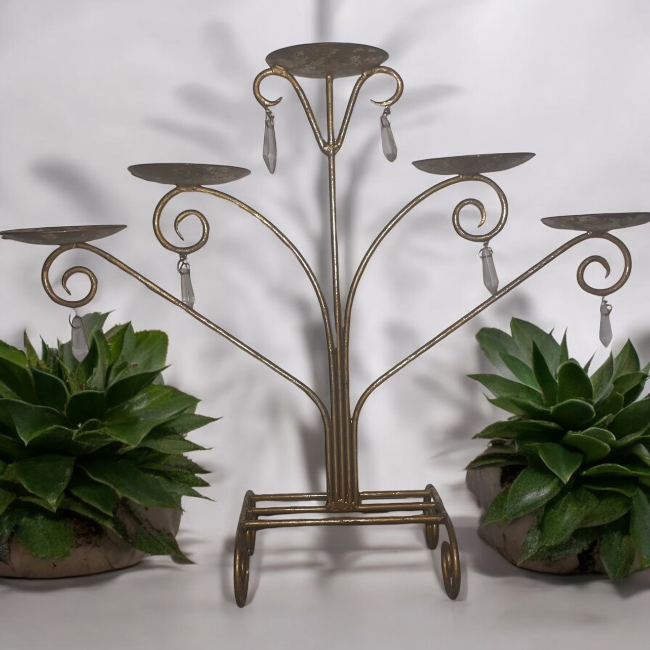 Five-arm metal candelabra with crystal accents. 18 inches high 21 inches wide A beauty that was used as a table prop