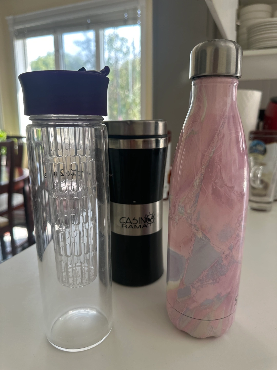 3 glass water bottle with a purple lid, a black and silver water bottle, and a pink marble water bottle. Each one $3