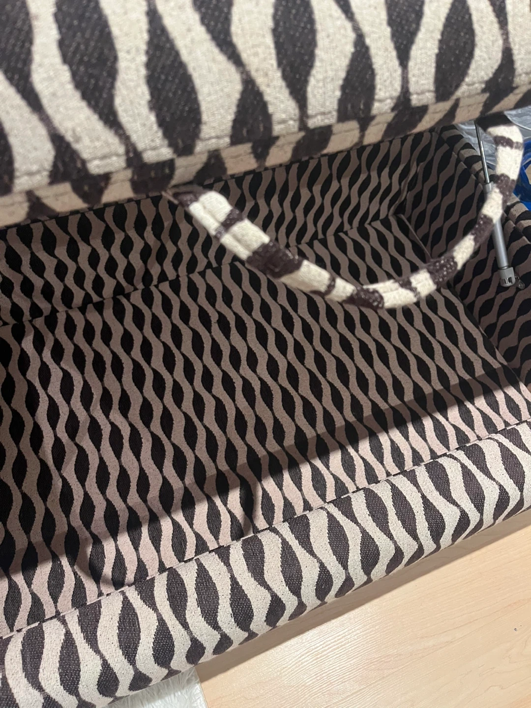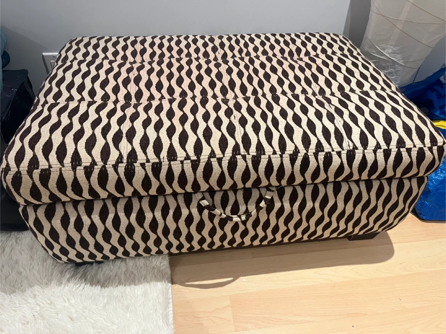 This storage ottoman features a stylish chocolate brown and beige geometric wave pattern. It's upholstered and includes a handle for easy opening. Perfect for stowing away blankets or other household items!