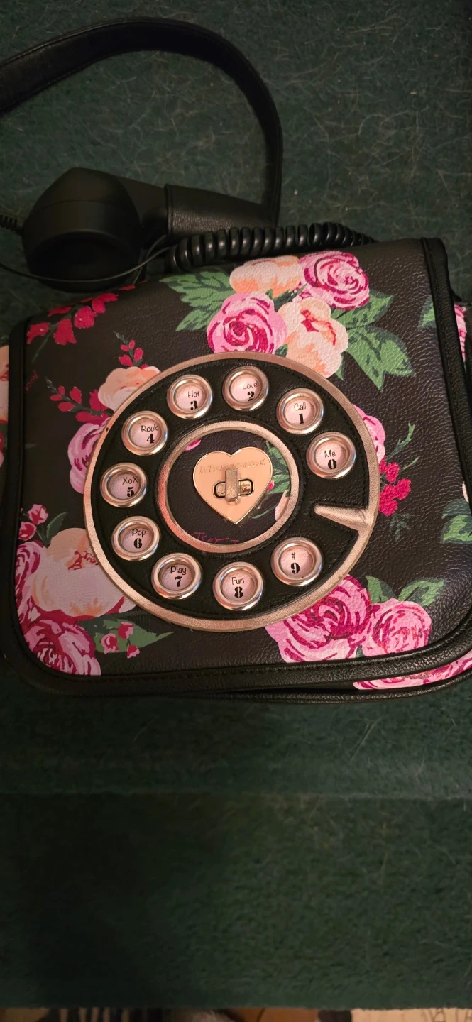 Betsey Johnson crossbody bag shaped like a rotary phone. It has a black background with a vibrant floral print. The bag features a detachable strap and a fun, unique design.