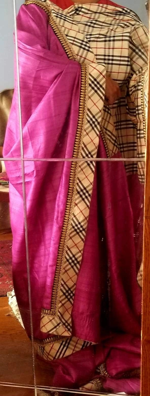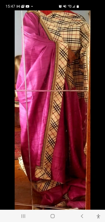 This saree is made of a soft, luxurious fabric and features a beautiful design. It would be perfect for any special occasion. It has a gorgeous, gold-trimmed border with a plaid pattern. It includes a matching blouse piece.