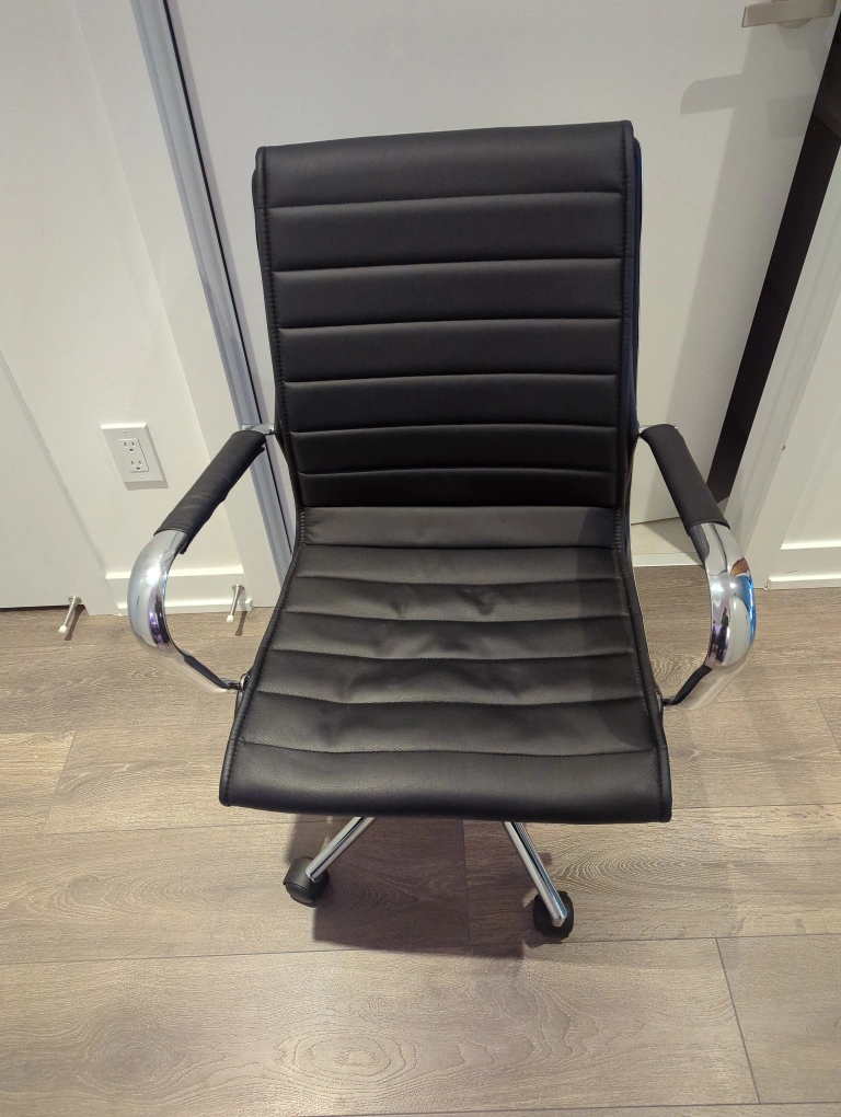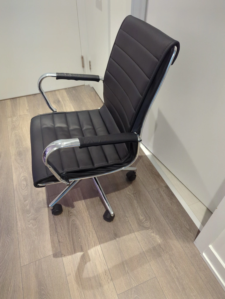 A comfortable office chair with a swivel base and five wheels. It is made of black leather. The height adjustment cylinder may need to be changed, but the chair leans back and works fine.