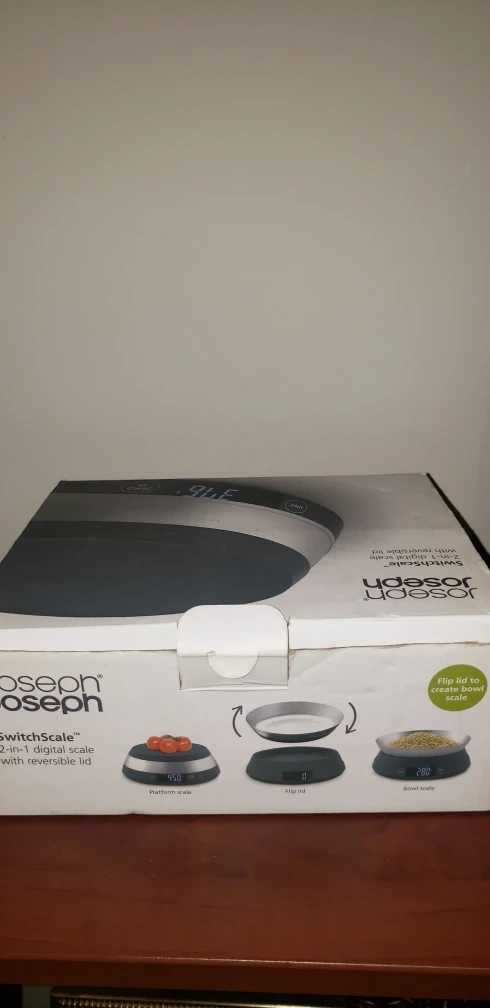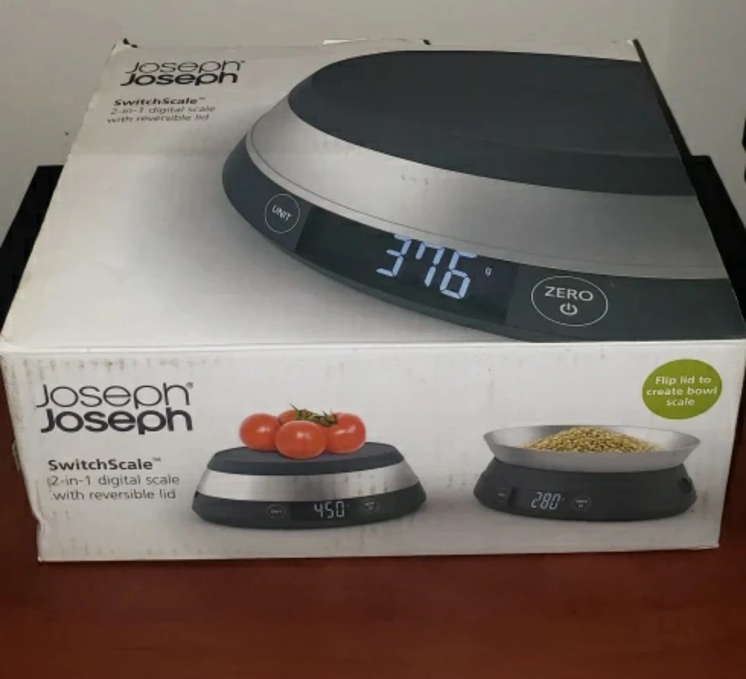 Joseph and Joseph Switch Scale 2-in-1 digital scale with reversible lid. It can be used as a regular scale, or you can flip the lid to create a bowl scale. Great for measuring ingredients when cooking or baking. In great gently used condition.