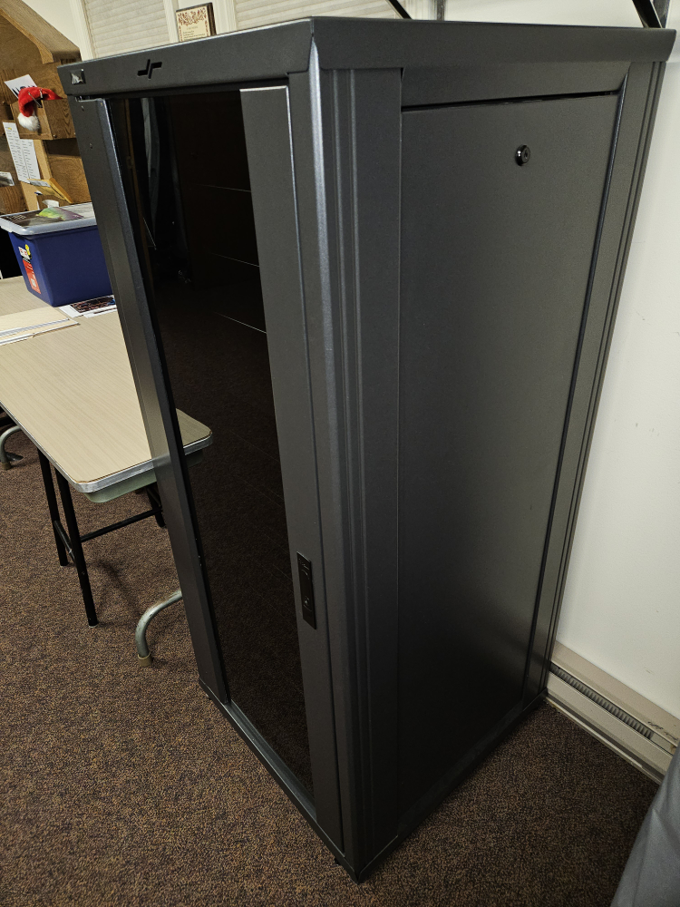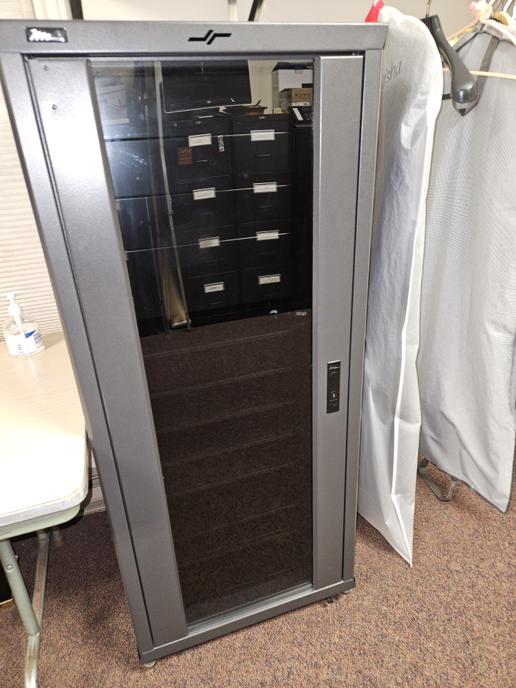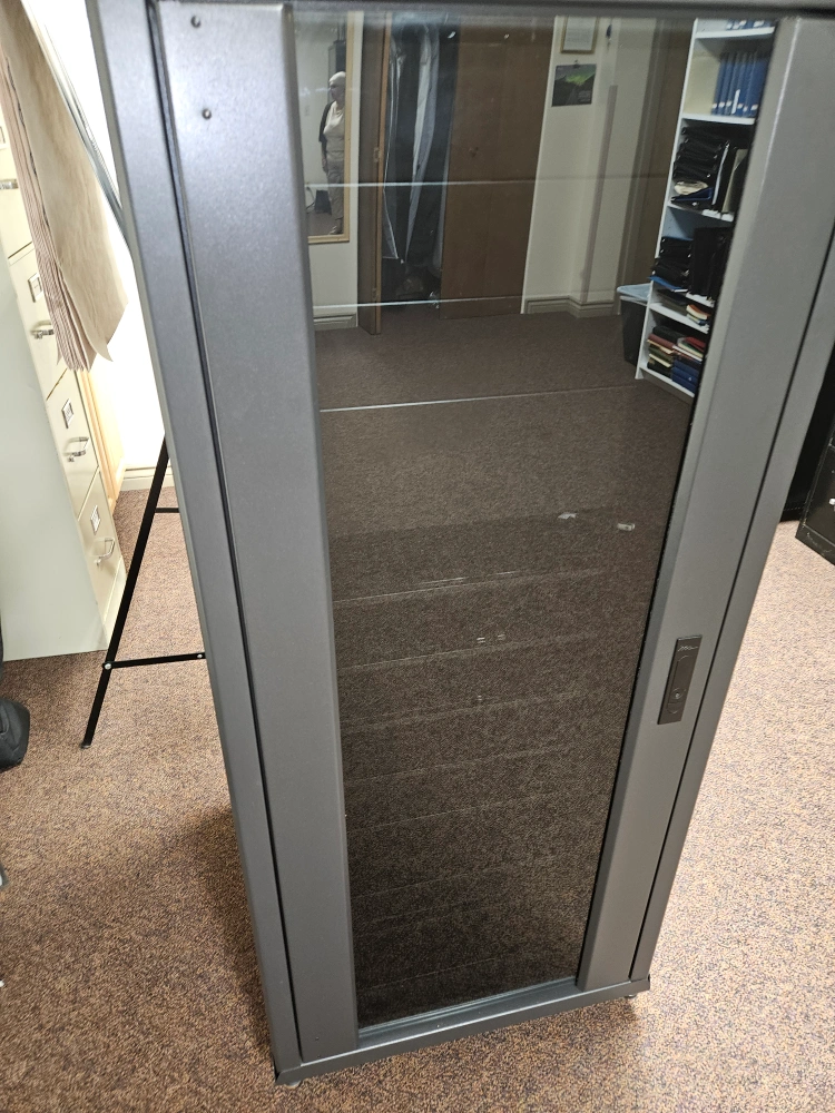 A audio visual cabinet with glass front door, removable sides with all 4 keys & multiple shelves. fan at top and on wheels. beechgrove/lawrence. asking 300 or BO