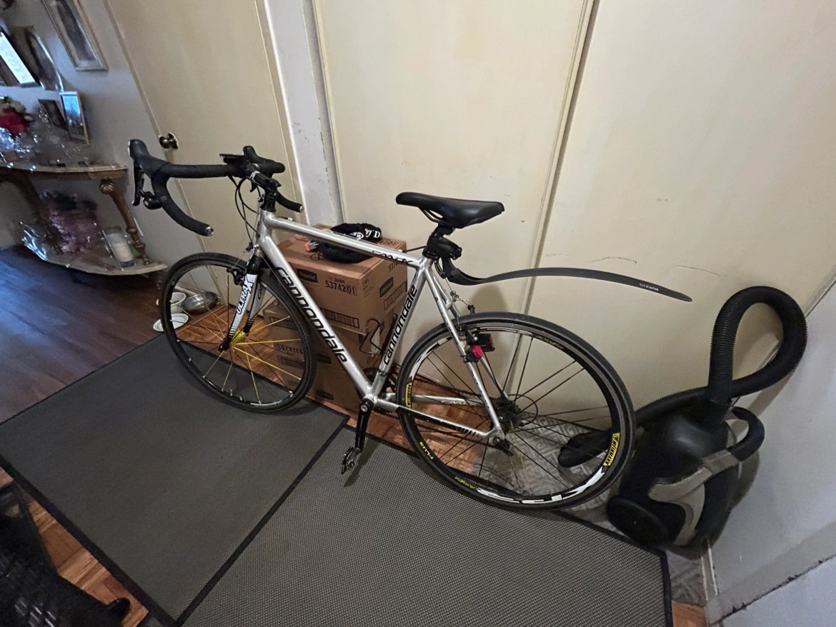 Silver Cannondale road bike. Comes with front and rear quick release wheels and a set of SPD pedals. It has a few scratches but is in good condition and rides well. The bike is ready to go and should be great for someone who is looking for a reliable and fast bike.