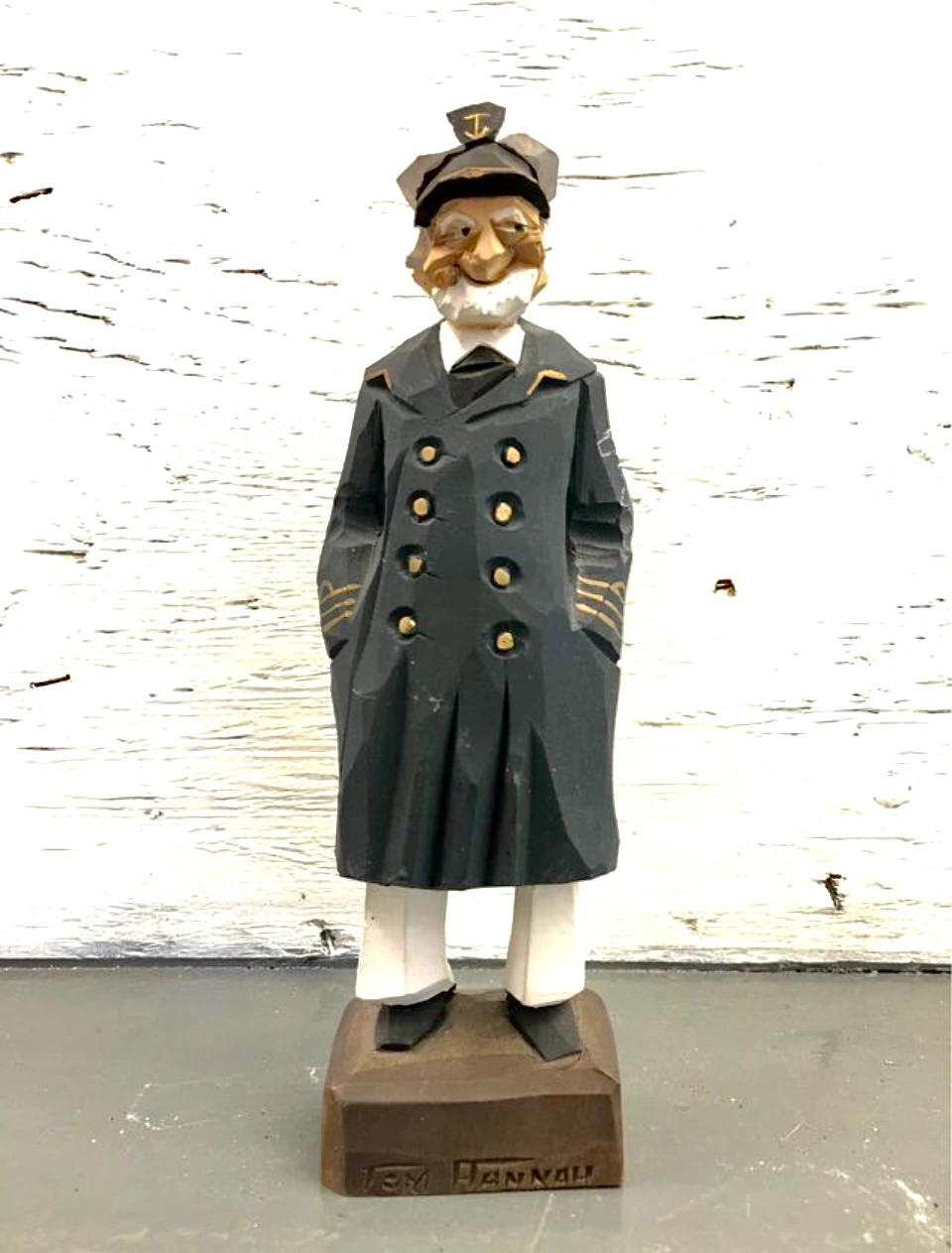 Hand carved wooden figure of a captain. The figure is approximately 12" tall. It is signed "Tom Hannah" on the base. The figure is in good condition.