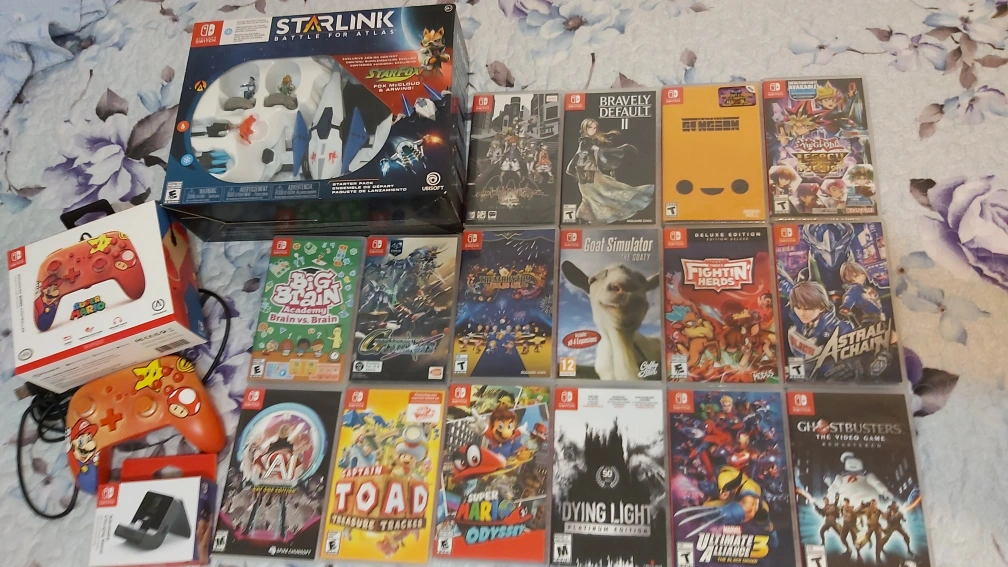 A bundle of various Nintendo Switch games, including some physical and digital copies. Switch Games Buy 3 get $10 off Buy 5 get $20 off Or buy everything for $500 Top Row are sealed games Pickup Midland and ellesmere, all Games available while listed $20 Ghost Busters $30 Each Starlink Collectors edition Brand New Big Brain Academy Goat Simulator Thems Fighting Herds $40 Yugioh Brand New Captain Toad Treasure Tracker Dying Light $50 Bravely Default 2 Brand New Enter the Gungeon Brand New SD Gundam Ai the Somonium Files Final Fantasy Thearythm Super Mario Oddyssey Marvel Ultimate Alliance 3 $60 Each Astral Chain The World Ends with You Brand New Switch Stand $20 Mario PowerA Controller $30 Will also trade for the following games Donkey Kong Tropical Freeze Luigis Mansion 2 Super Mario 3D World Dragon quest 11 Princess Peach Showtime