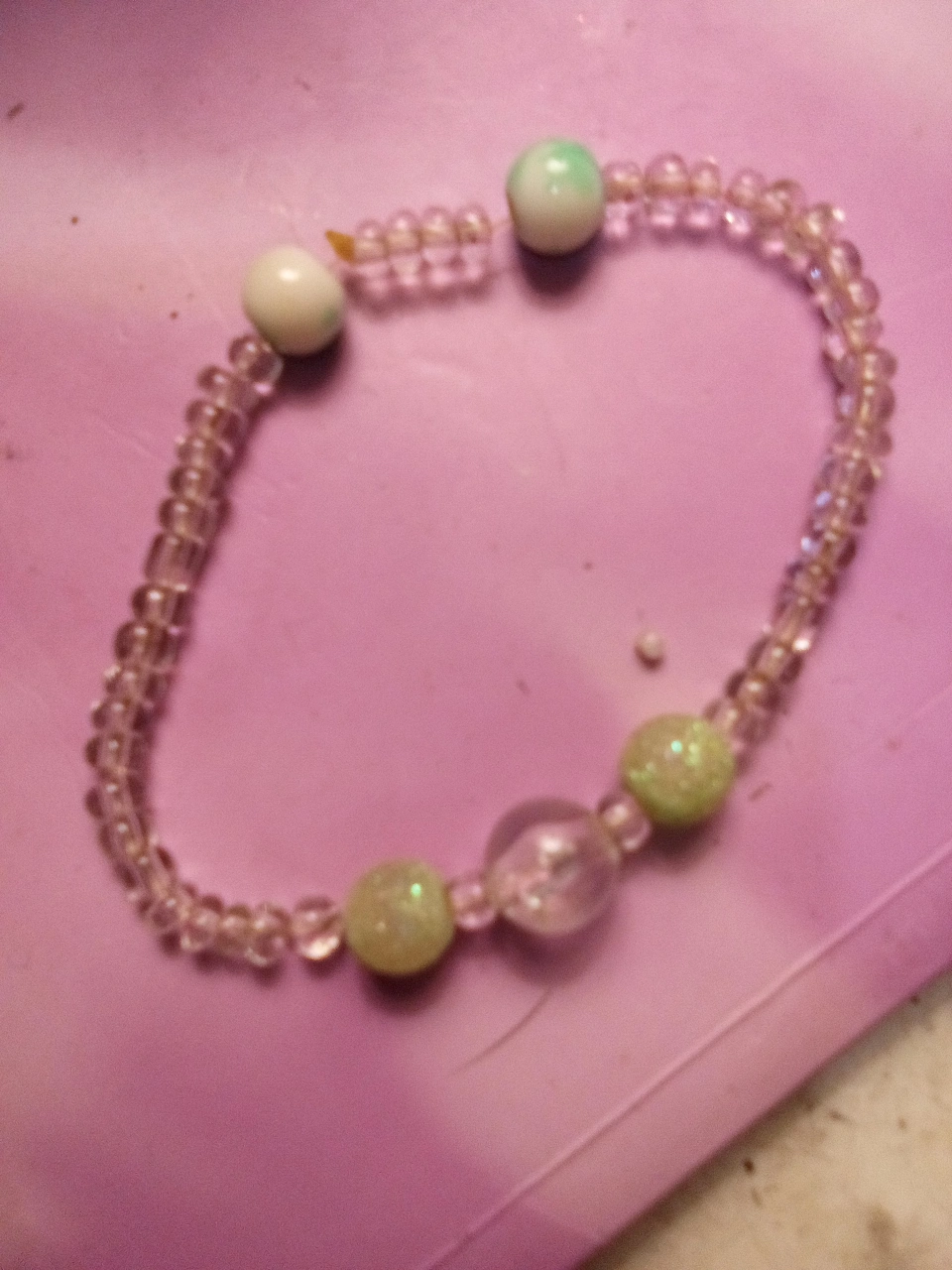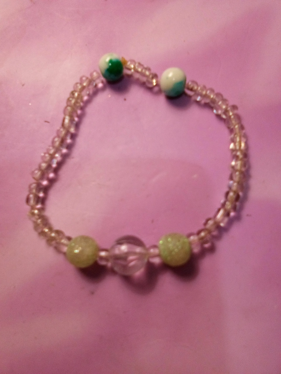 A simple beaded bracelet with clear beads, green and white beads, and a larger clear crystal bead.Cute smooth on the skin only available for pickup 🙂 ♥️🥳🥳