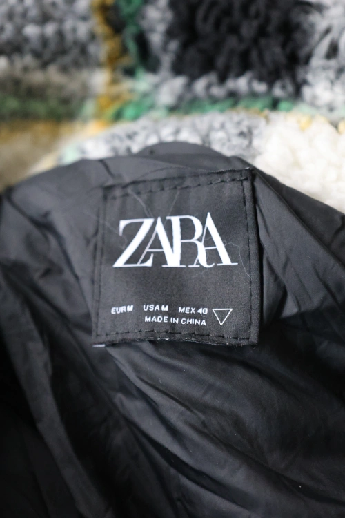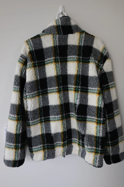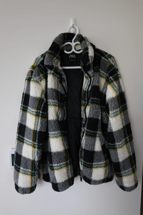 A warm and cozy fleece jacket with a plaid pattern. It has a zip up front and a stand up collar. The jacket is made by Zara and is size M.