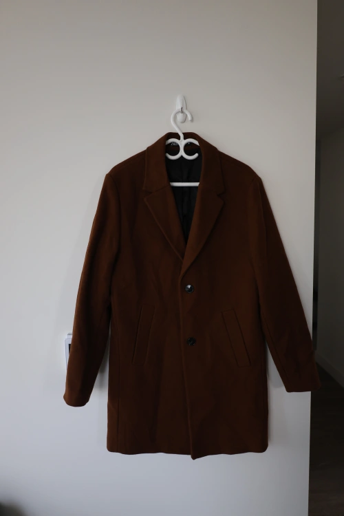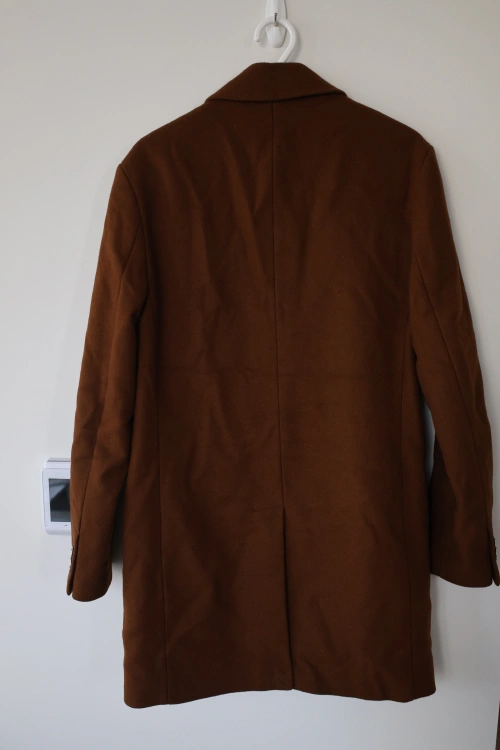 Men's brown coat from Zara, size M. Features a classic silhouette with a notch collar, two front pockets, and a single button closures.