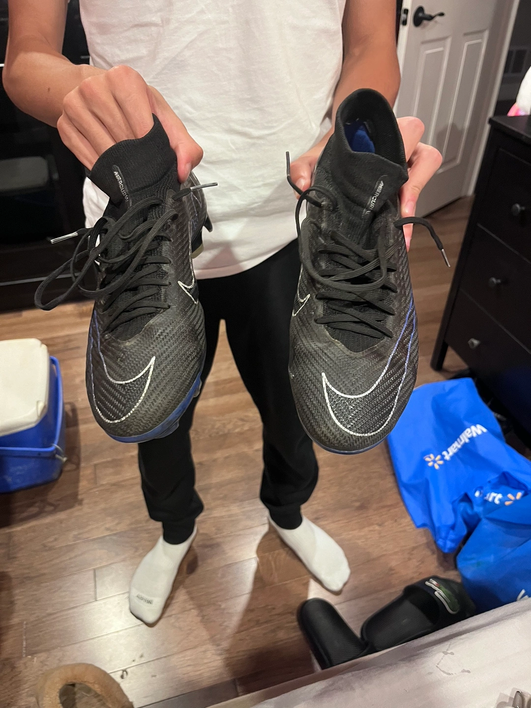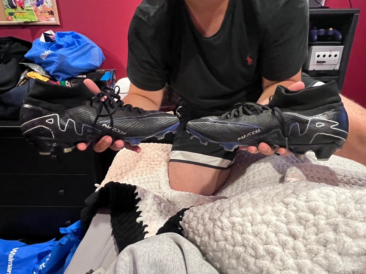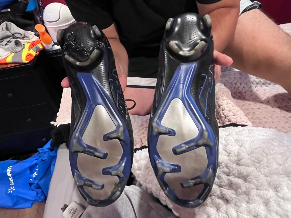 Soccer cleats with a black and blue colour scheme. They have been worn a couple of times, but they’re in really good condition.size 9
