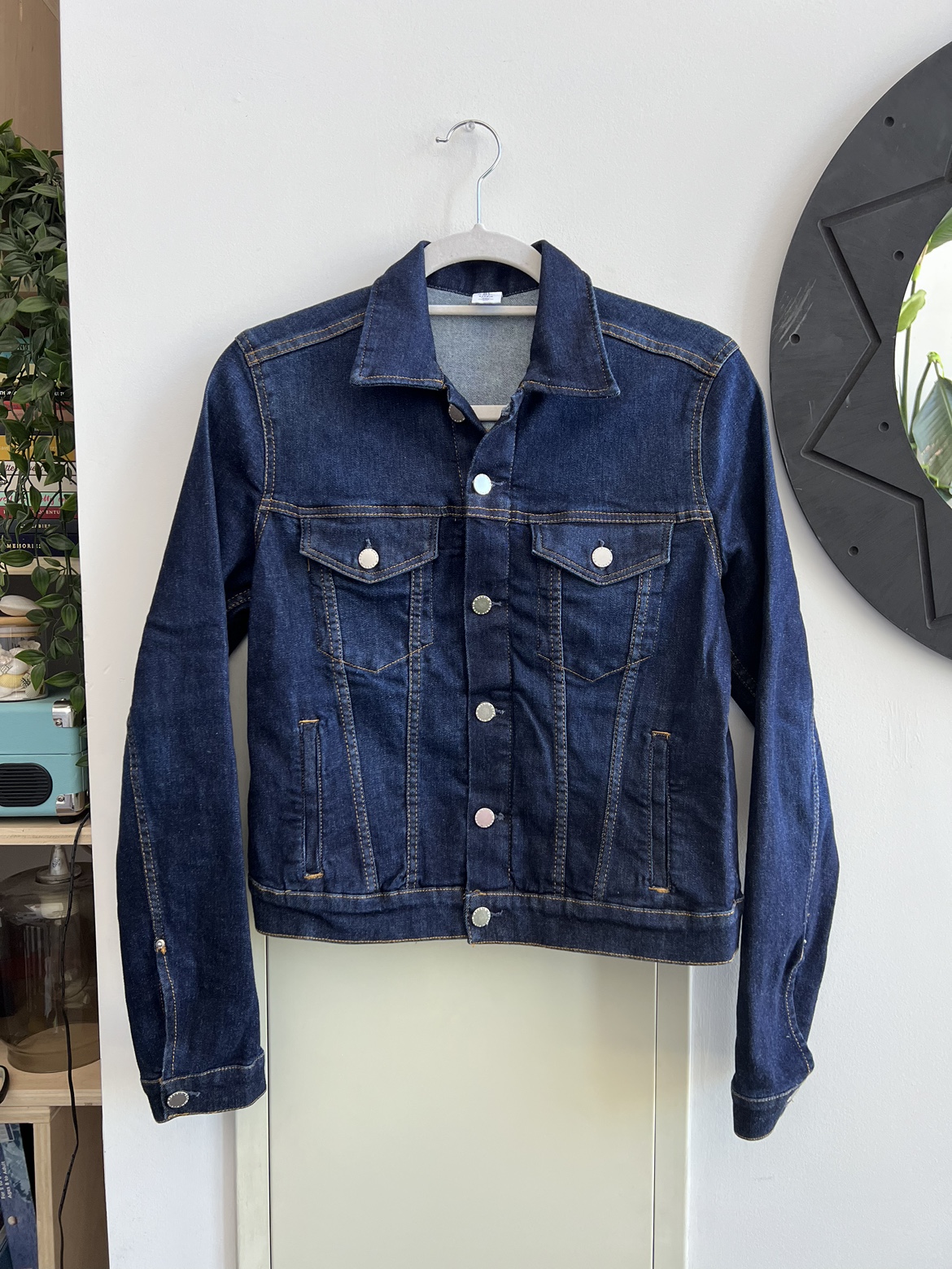 Dark blue denim jacket with silver buttons.