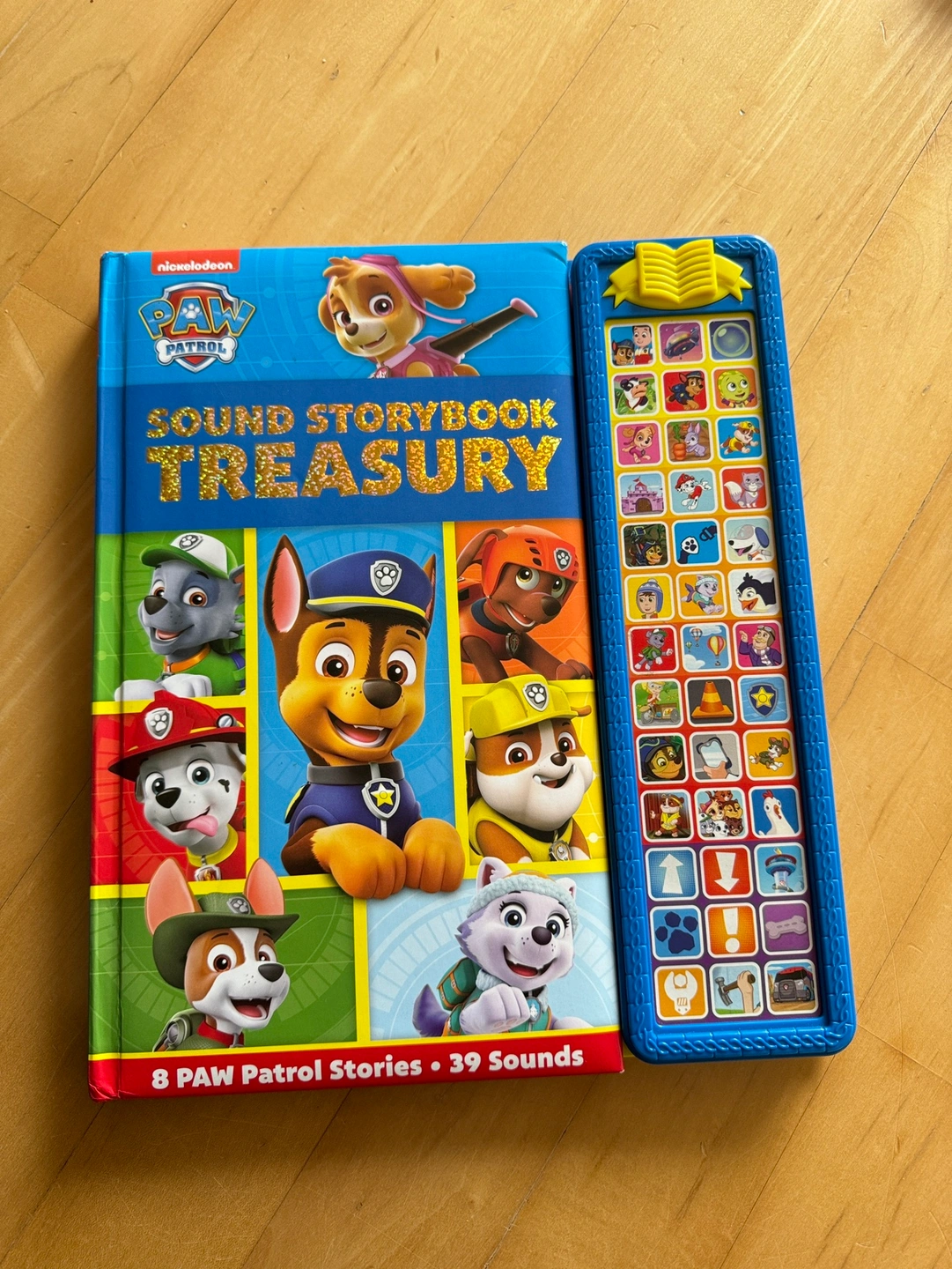 This is a hardcover storybook with an interactive sound bar. It includes 8 Paw Patrol stories and 39 different sounds. The sound bar features buttons with pictures and a book-shaped handle.
