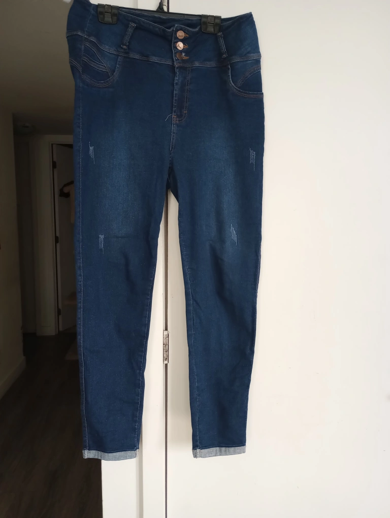 Blue jeans with a high waist and rolled cuffs.