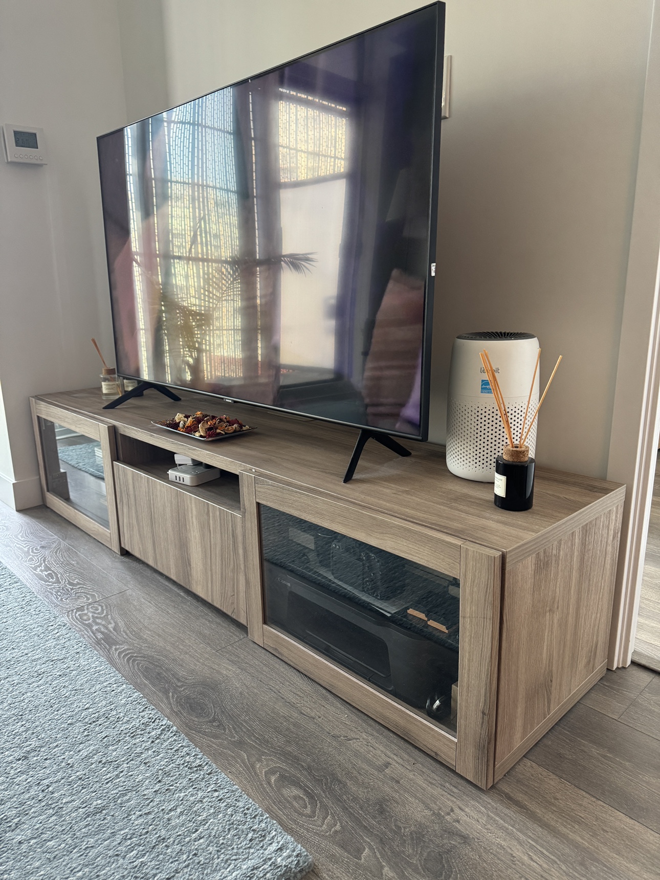 Minimalist TV bench with glass doors - IKEA