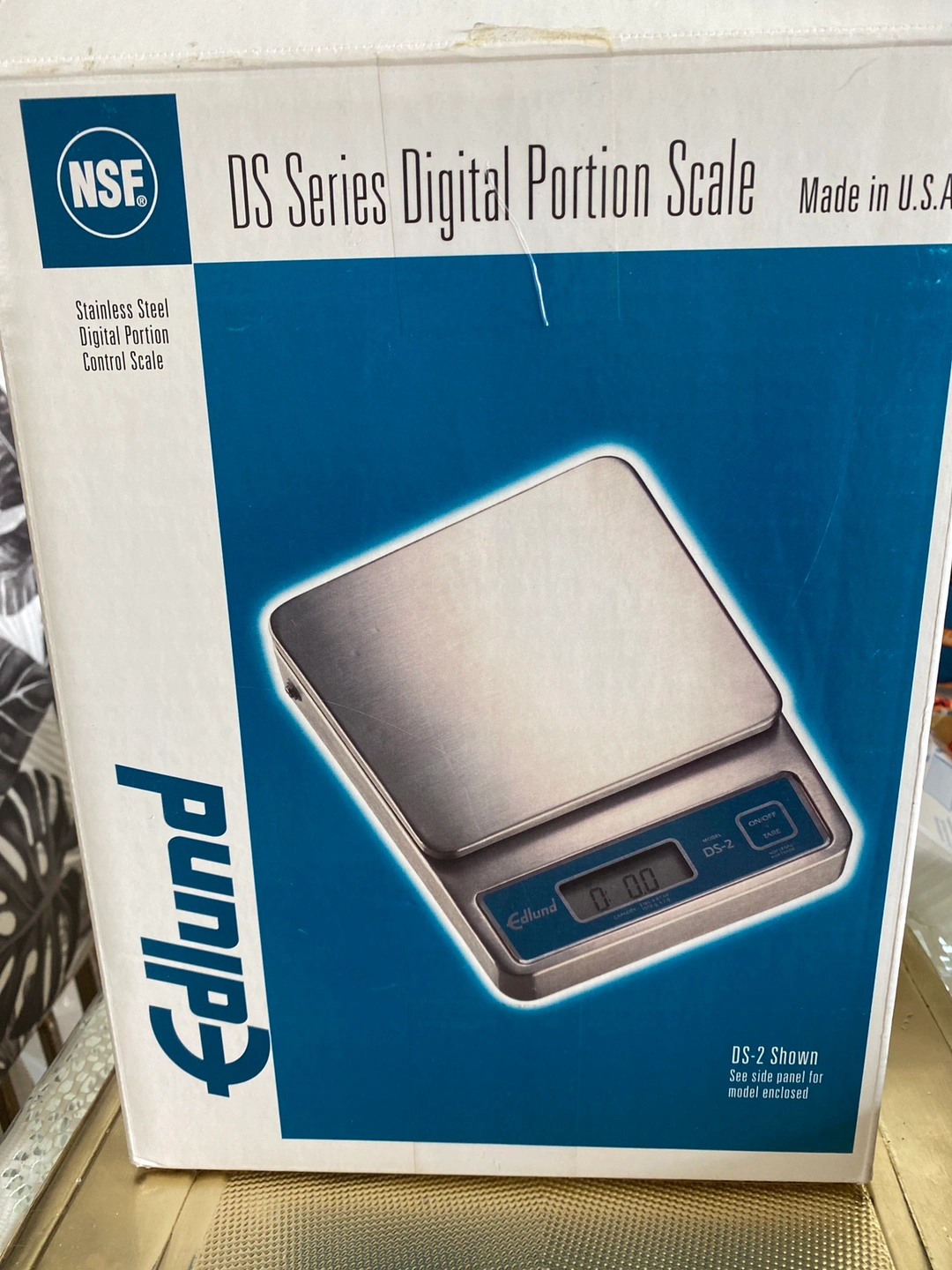 Digital portion scale made by Edlund. The scale is stainless steel. It appears to be new, in unopened packaging.