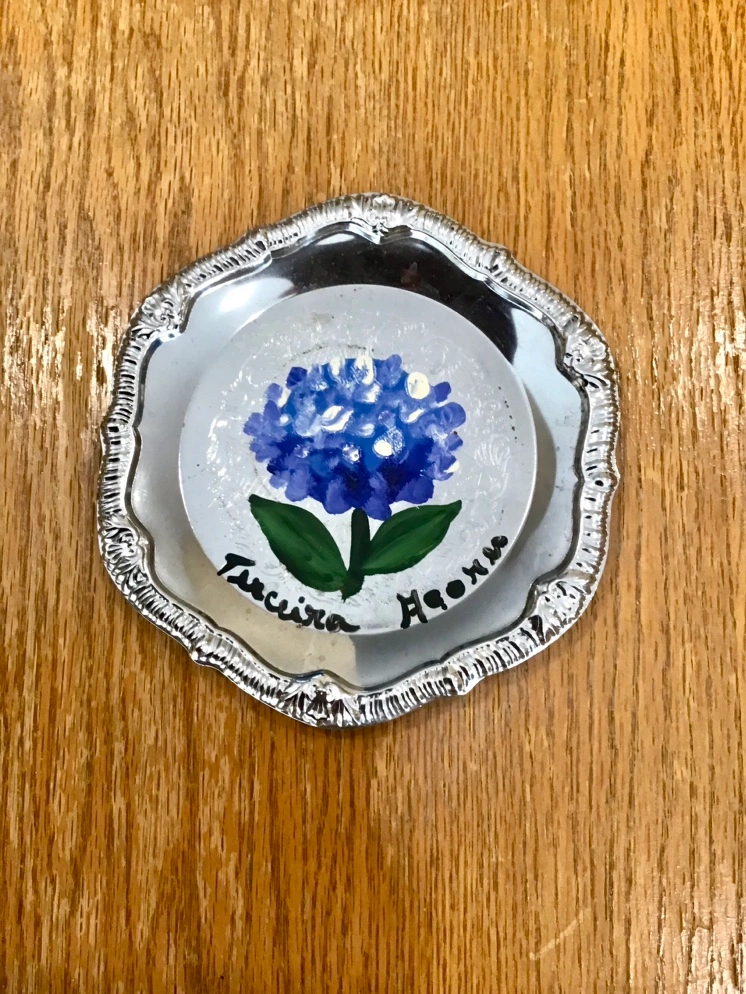 Small silver plate with hand painted blue flower. It is about 5 inches in diameter.